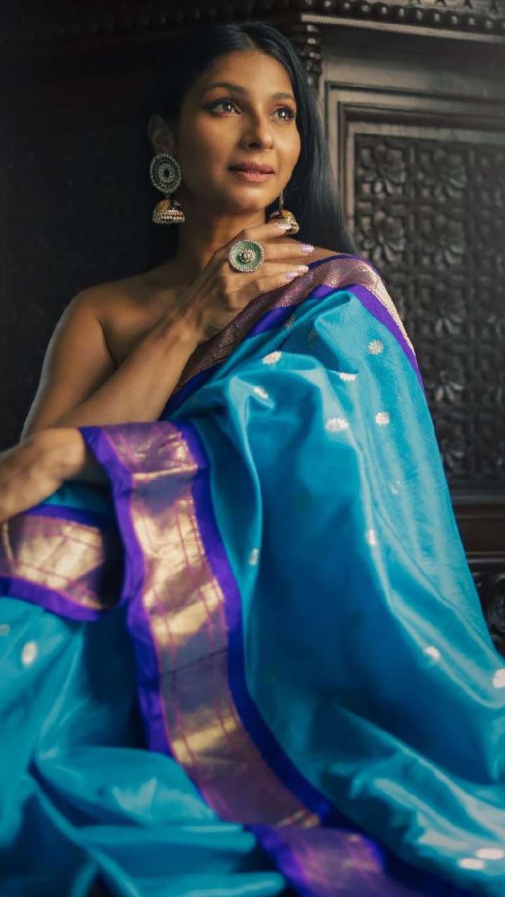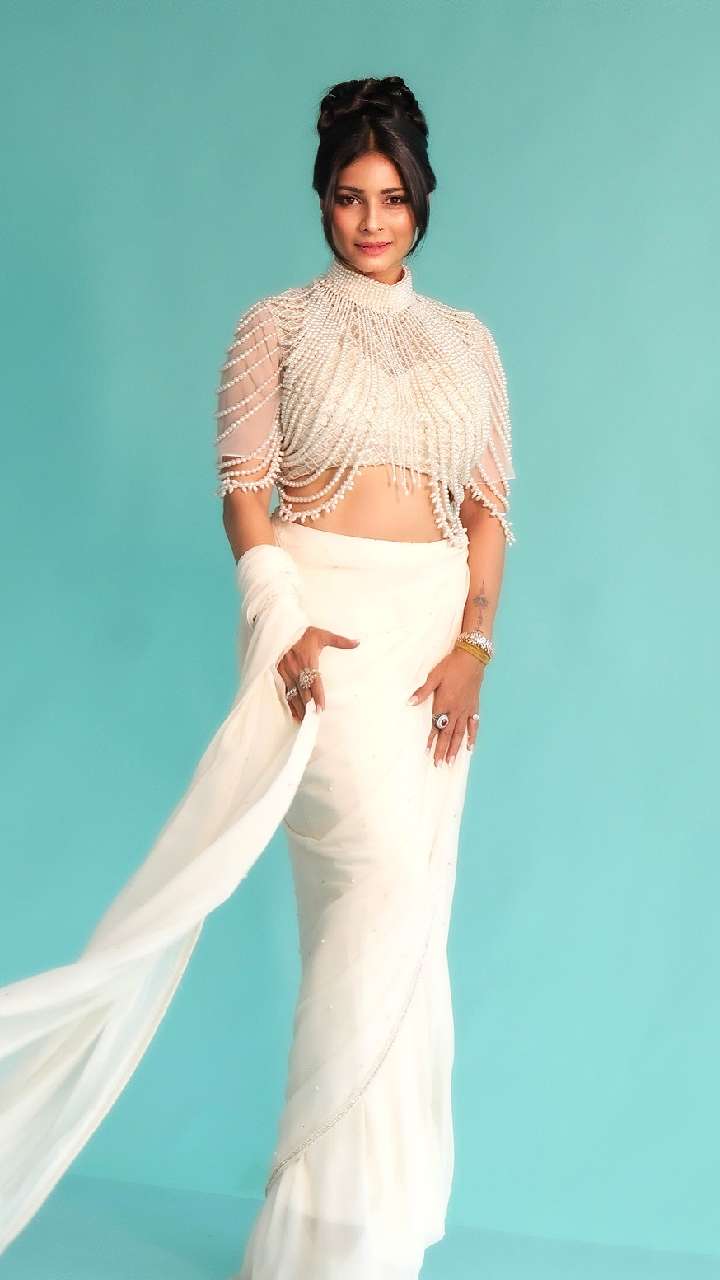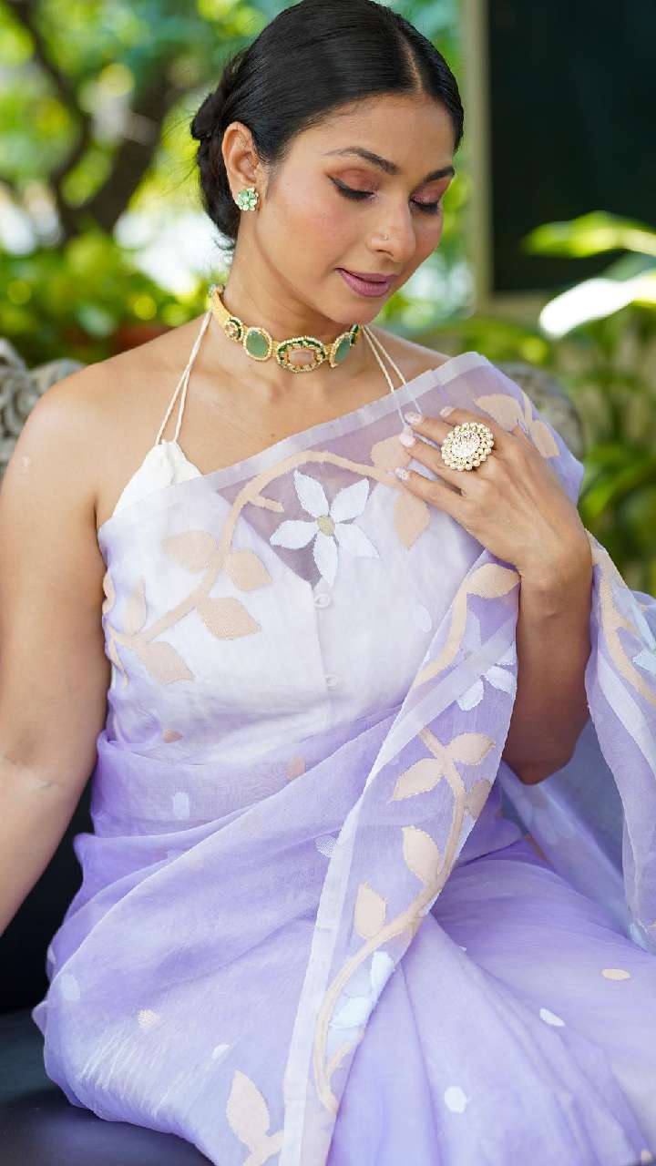 तनीषा मुखर्जी की लेवेंडर कलर की टिशू साड़ी में बेहद बोल्ड अंदाज में नजर आ रही हैं। इसके साथ भी स्ट्रैपलेस ब्लाउज पेयर किया जा सकता है।
