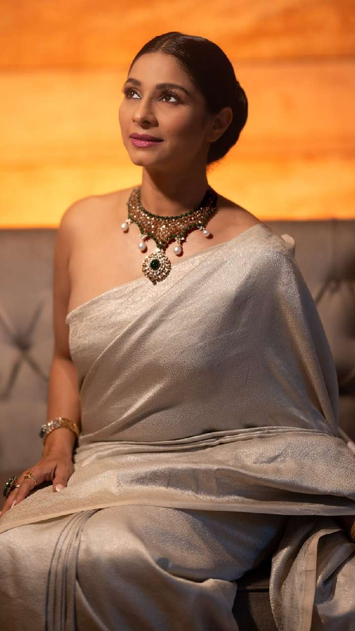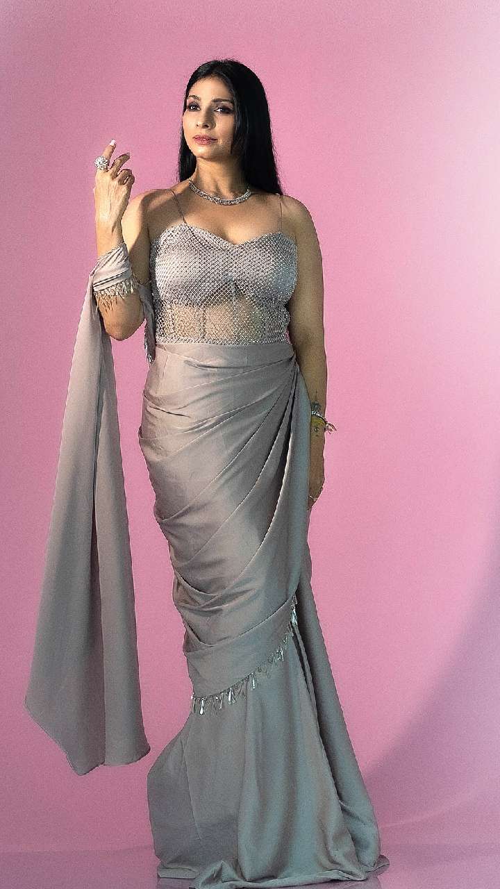 हाल में डीवा ने सिल्वर कलर की प्लेन साड़ी में अपना गॉर्जियस लुक शेयर किया है। जिसके साथ उन्होंने स्ट्रैपलेस ब्लाउज पहना है।