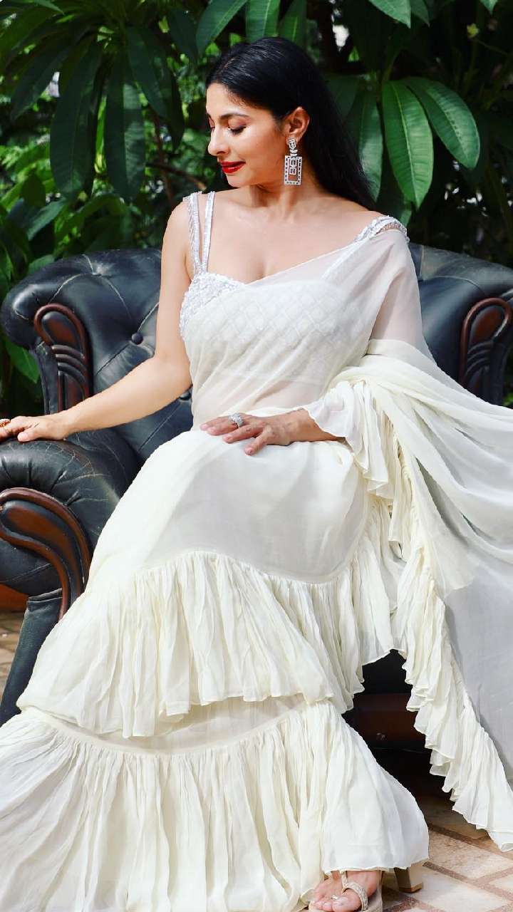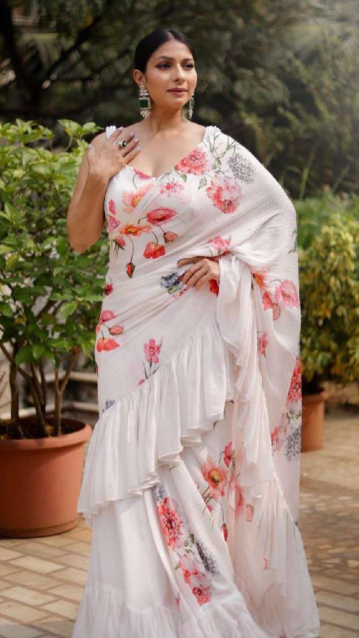 रफल साड़ियां आपके लुक को स्टाइलिश बनाती हैं। वही अगर आप इसके साथ स्ट्रैपलेस ब्लाउज पेयर करते हैं तो आपके लुक में चार चांद लग जाएगा।