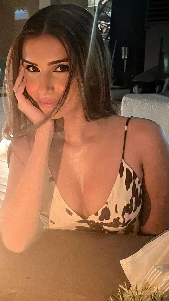 तारा तस्वीर में जेब्रा प्रिंटेड डीप नेक ड्रेस में बेहद हॉट और ब्यूटीफुल लग रही है।