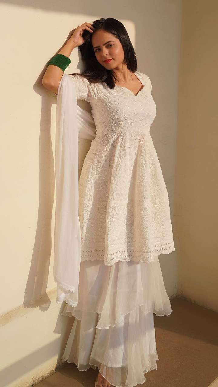 समर सीजन में इस तरह के व्हाइट चिकनकारी सूट काफी कूल लुक देते हैं। ऐसे में पलक का ये सूट इफ्तार पार्टी के लिए बेस्ट है।