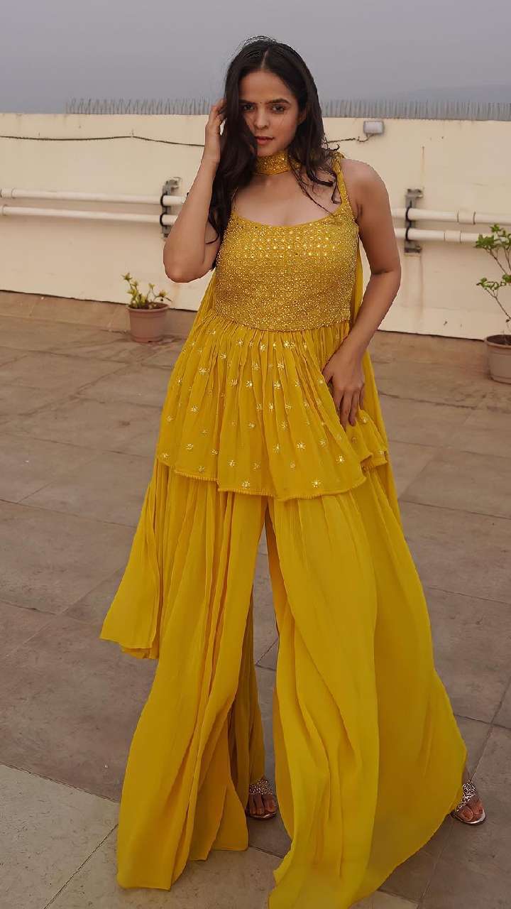 आजकल पेप्लम स्टाइल सूट काफी ट्रेंड में हैं। ऐसे में आप एक्ट्रेस के येलो मिरर वर्क सूट को भी इफ्तार पार्टी में पहनकर रौनक बढ़ा सकती हैं।