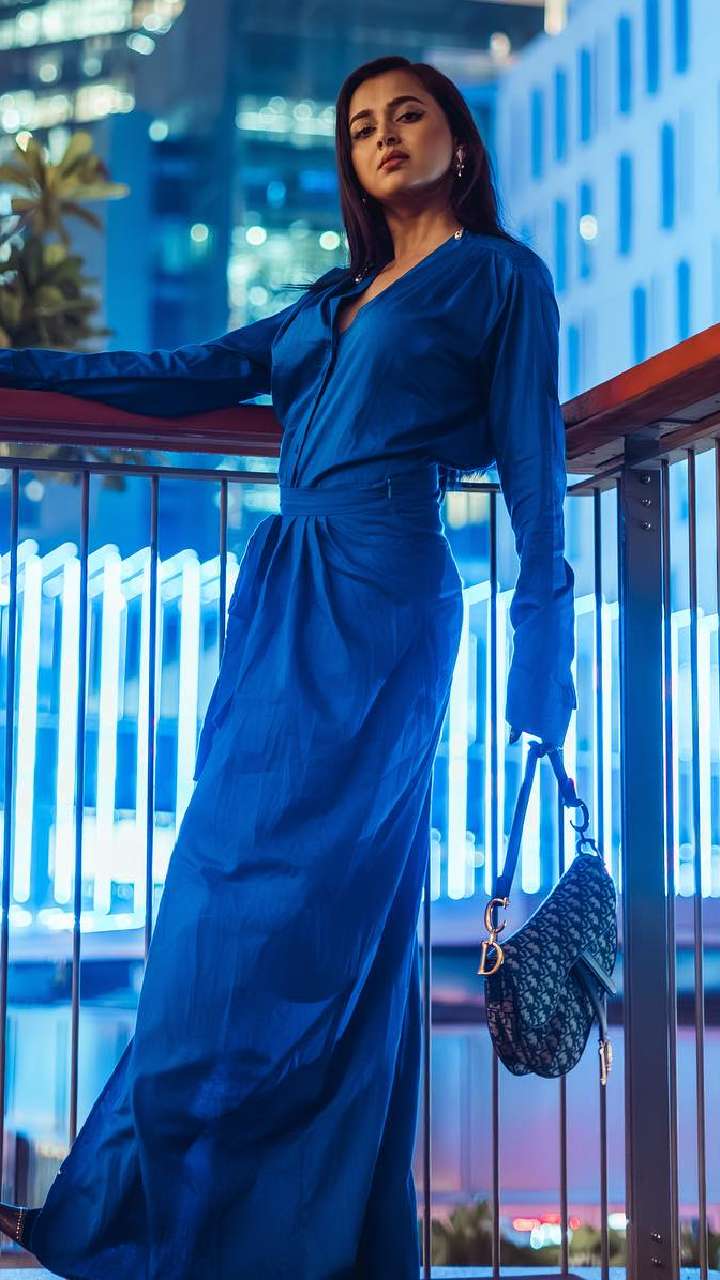 तेजस्वी ने इंस्टाग्राम पर ब्लू गाउन में अपना लेटेस्ट गॉर्जियस लुक शेयर किया है। इसके साथ एक्ट्रेस ने मैचिंग बैग भी कैरी किया है।