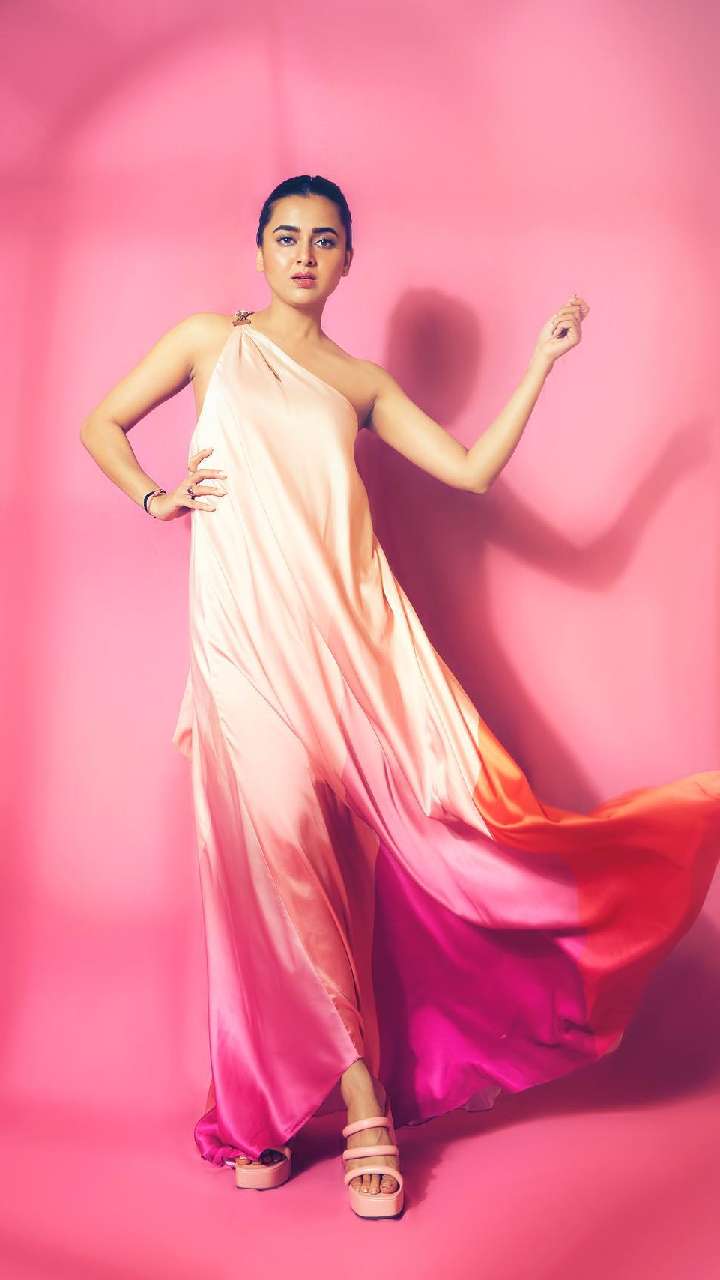 इस डीपनैक शिमरी गाउन में तेजस्वी काफी ग्लैमरस नजर आ रही हैं। पार्टी के लिए ये लुक बेस्ट है।