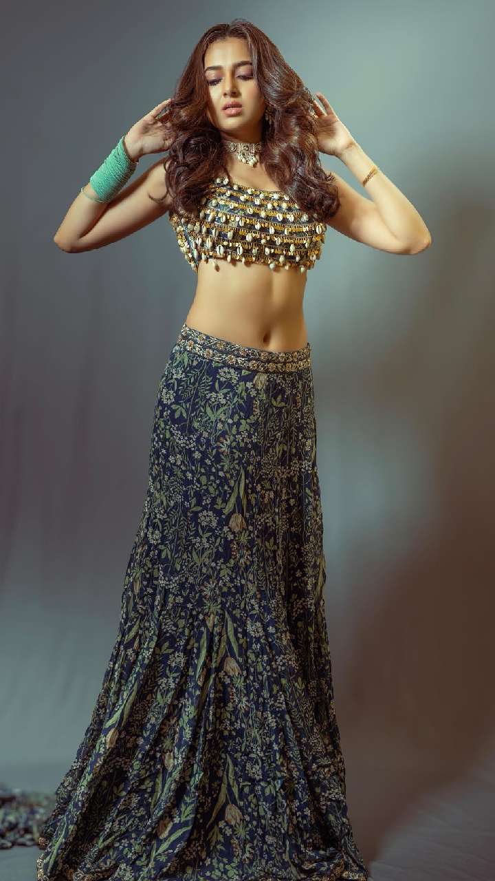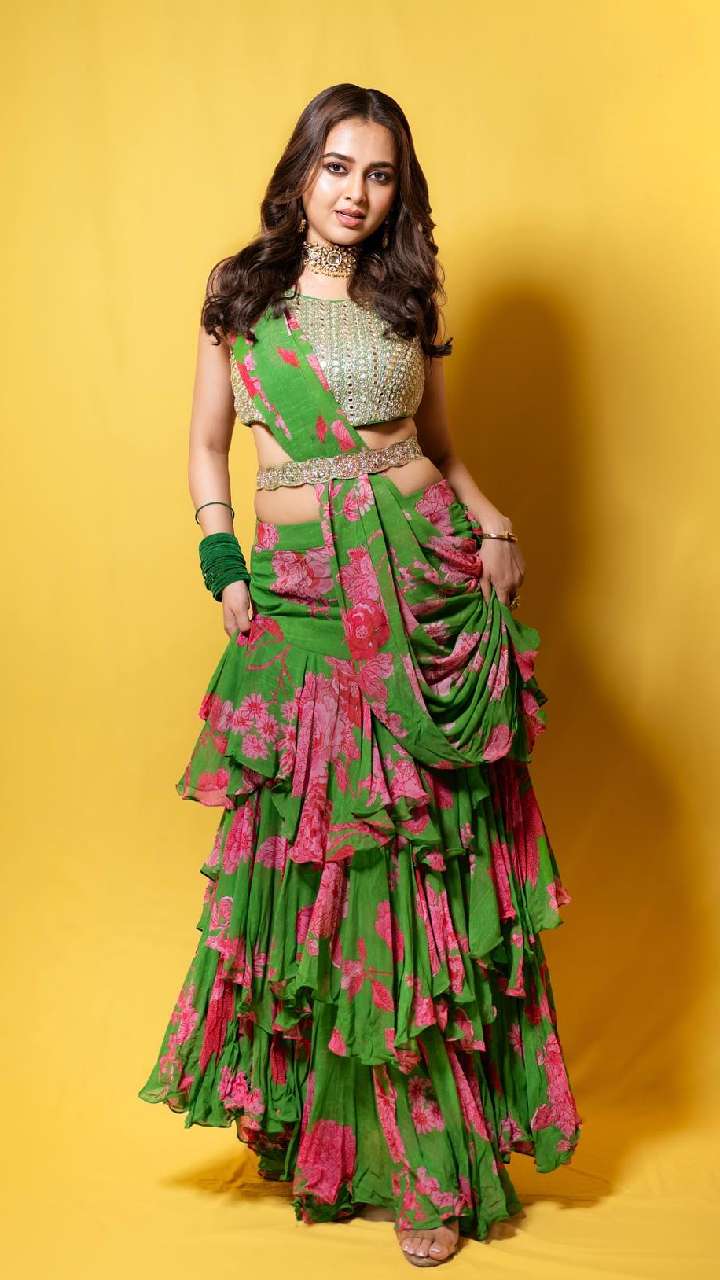 तेजस्वी इस ग्रीन कलर के प्रिंटेड रफल लहंगे हेवी मिरर वर्क चोली और बेल्ट में कहर ढहा रही हैं।