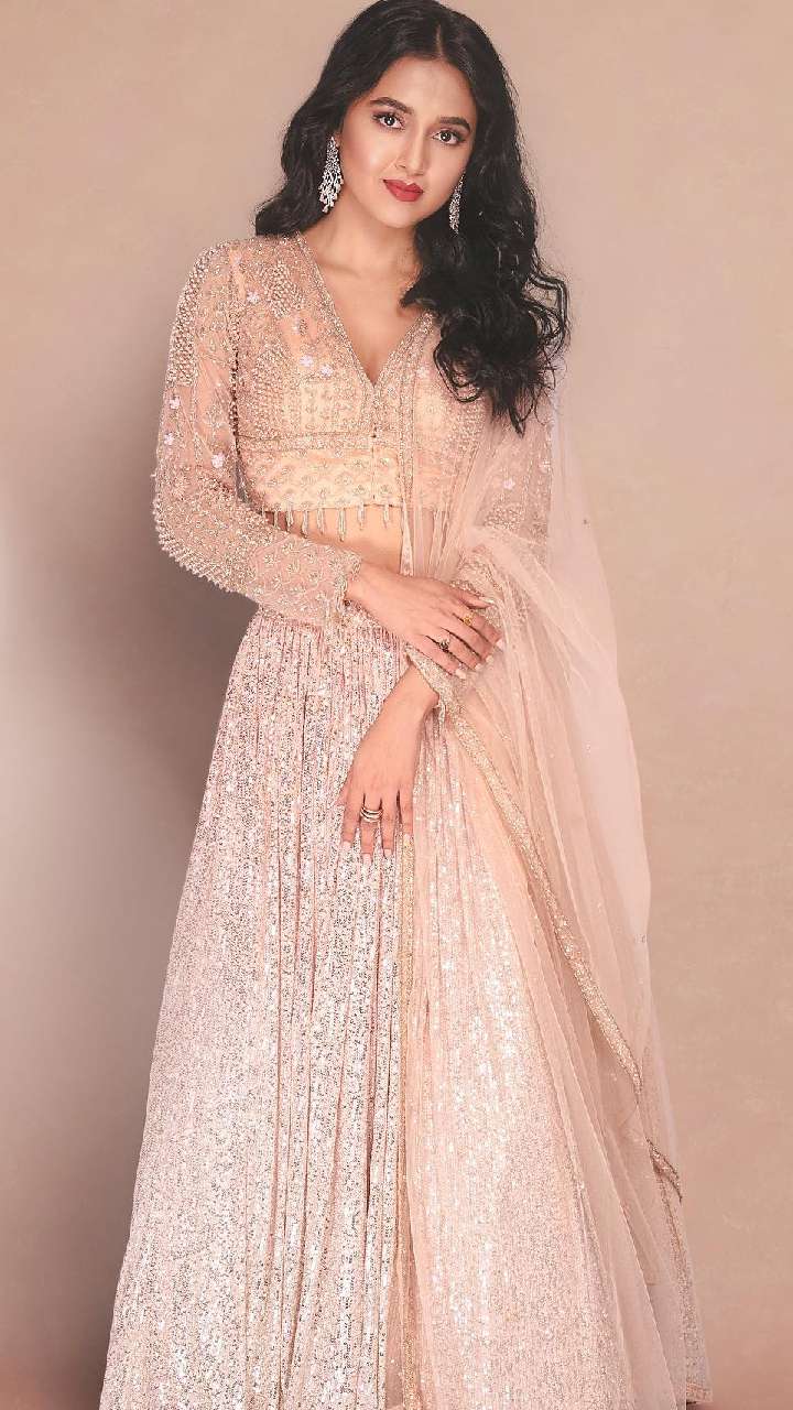 अभिनेत्री इस लाइट पिंक कलर के हैवी वर्क लहंगे कानों में मैचिंग इयररिंग और ओपन कर्ली हेयर में गॉर्जियस लग रही हैं।