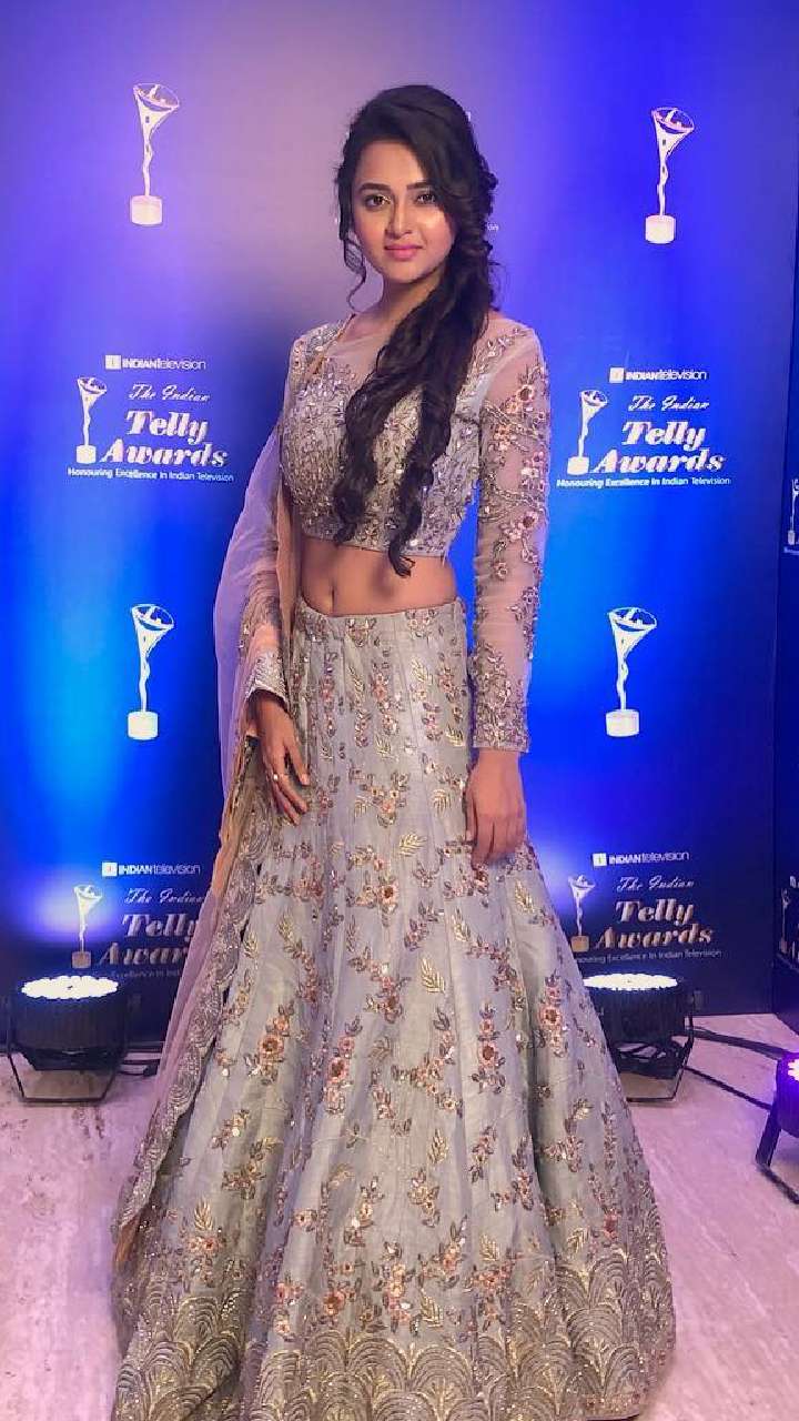 आप चाहे तो ओल्ड फैशन को रीक्रिएट करते हुए तेजस्वी के इस ग्रे कलर के गोल्डन वर्क लहंगे को ट्राई कर सकती हैं।