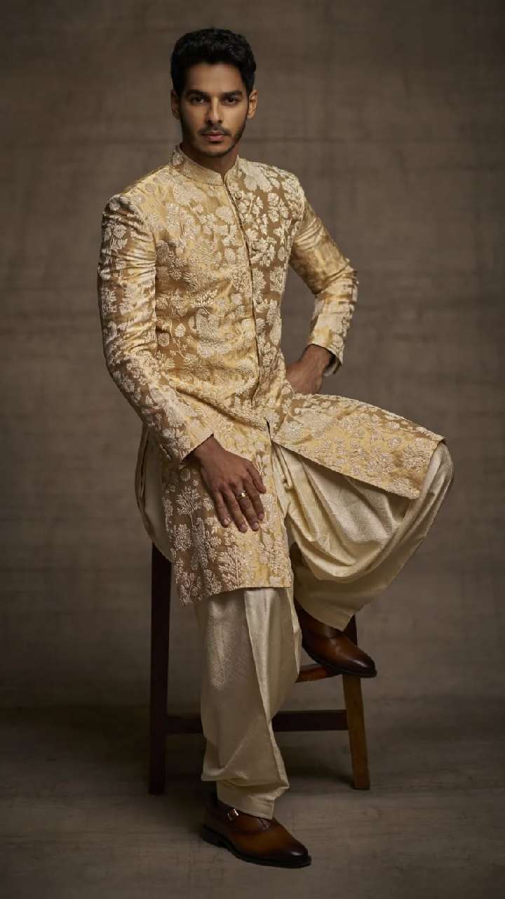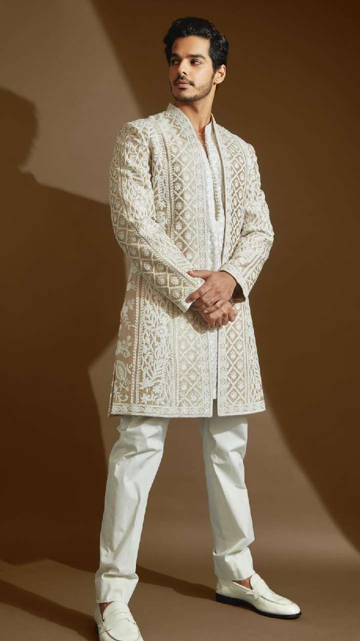 ईशान खट्टर स्टाइलिश शेरवानी में काफी हैंडसम दिखाई दे रही हैं। उनका यह लुक फैंस ने खूब पसंद किया।