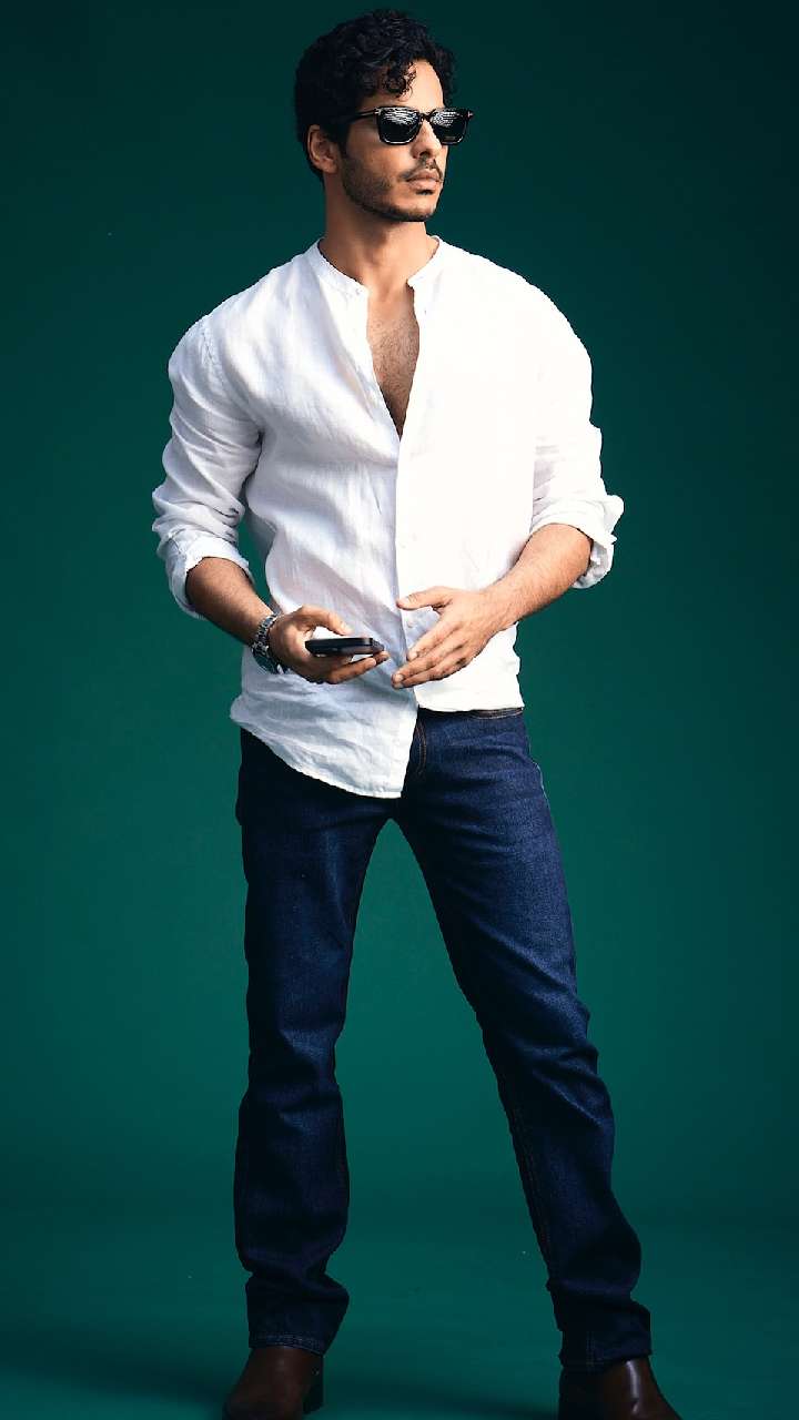 ईशान खट्टर का हर लुक स्टाइलिश और क्लासी होता है। इस तस्वीर में उन्होंने व्हाइट शर्ट के साथ ब्लू जींस स्टाइल किया है।