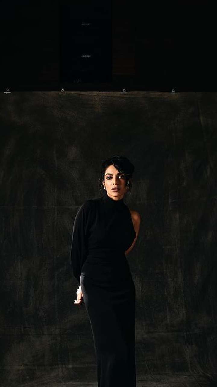 शोभिता धुलिपाला की यह ब्लैक फ्रिल ड्रेस भी आप नाइट पार्टी में कैरी कर सकते हैं, इस लुक के साथ एक्ट्रेस ने स्मोकी मेकअप किया है।