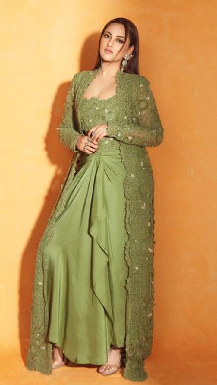 शादी के लिए कपड़े पसंद करना सबसे मुश्किल होता है। सोनाक्षी का यह आउटफिट शादी और मेहंदी फंक्शन के लिए परफेक्ट है।