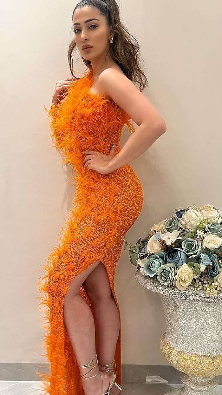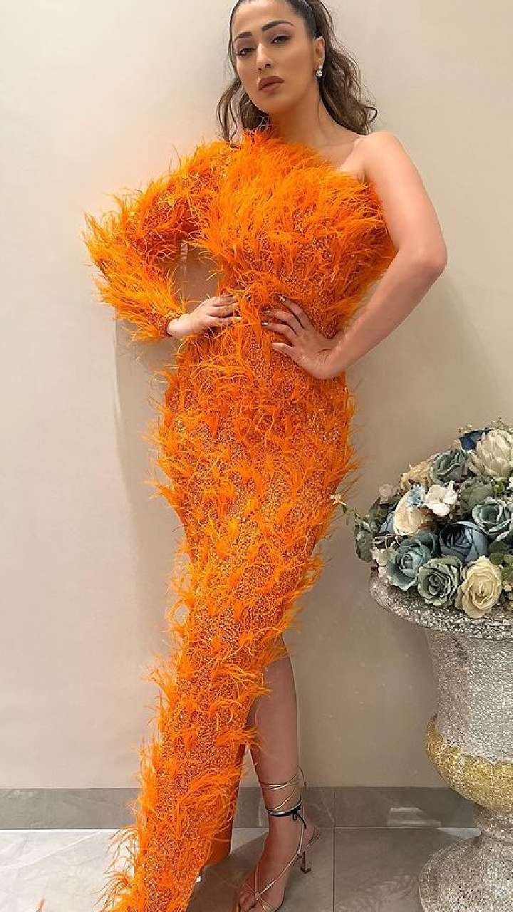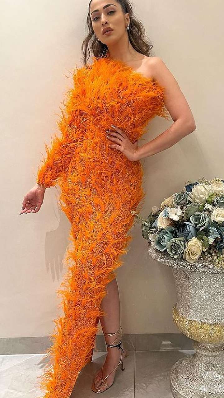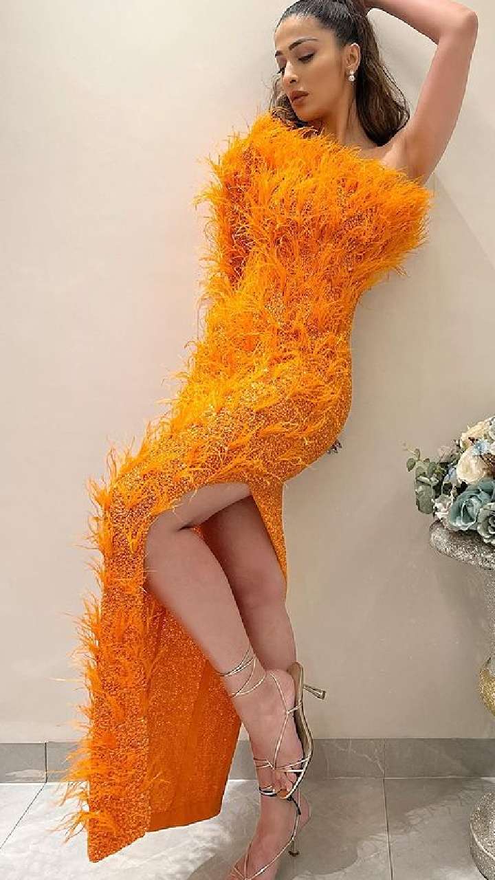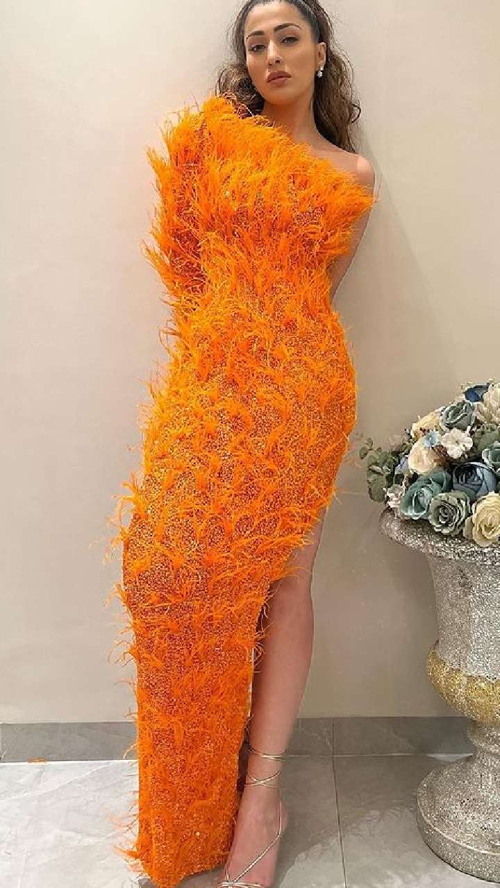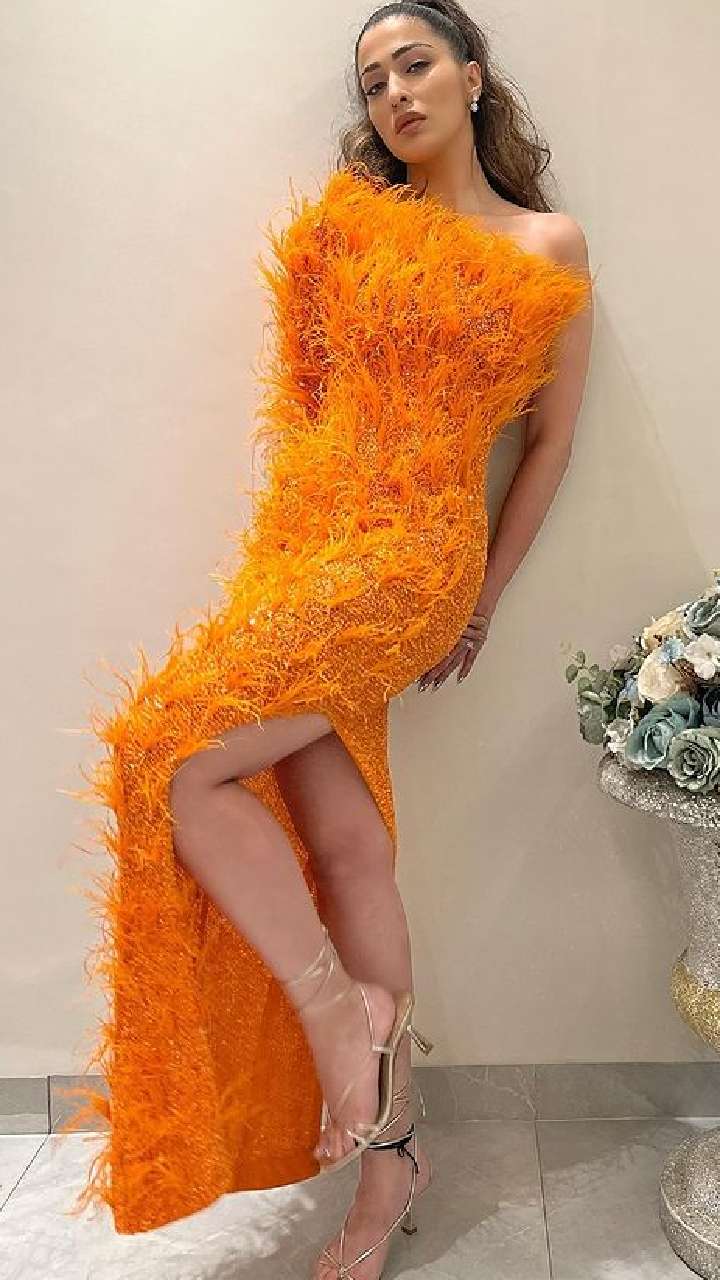 लेटेस्ट फोटोज में एक्ट्रेस ने ऑरेंज कलर की हाई थाई स्लिट फेदर ड्रेस कैरी की है।