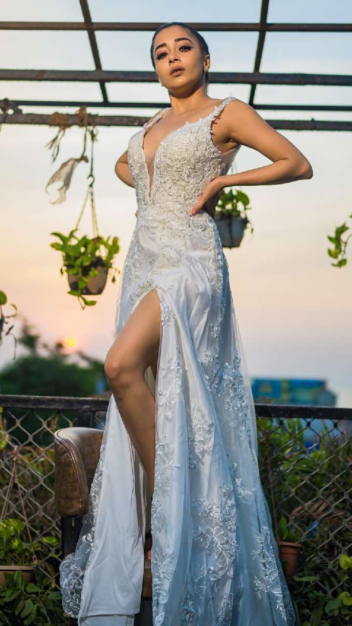 टीना इस ब्लू कलर के कट आउट हाई स्लिट गाउन विद बोल्ड मेकअप में बेहद ग्लैमरस नजर आ रही हैं। इसके साथ उन्होंने बन हेयर स्टाइल पेयर किया है।