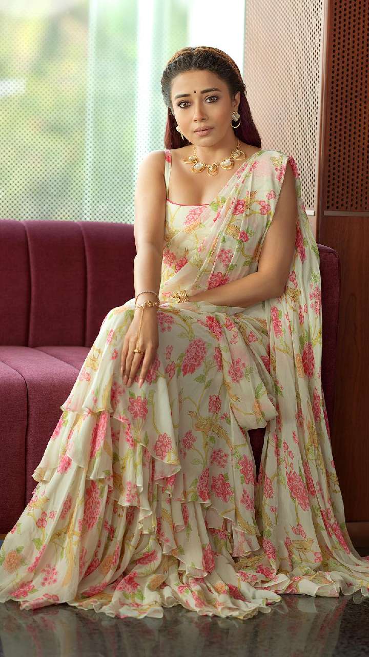 फिलहाल रफल साड़ी काफी ज्यादा ट्रेंड में है। आप भी इस तरह की फ्लावर प्रिंटेड रफल साड़ी को इस नवरात्रि में कैरी कर सकती हैं।