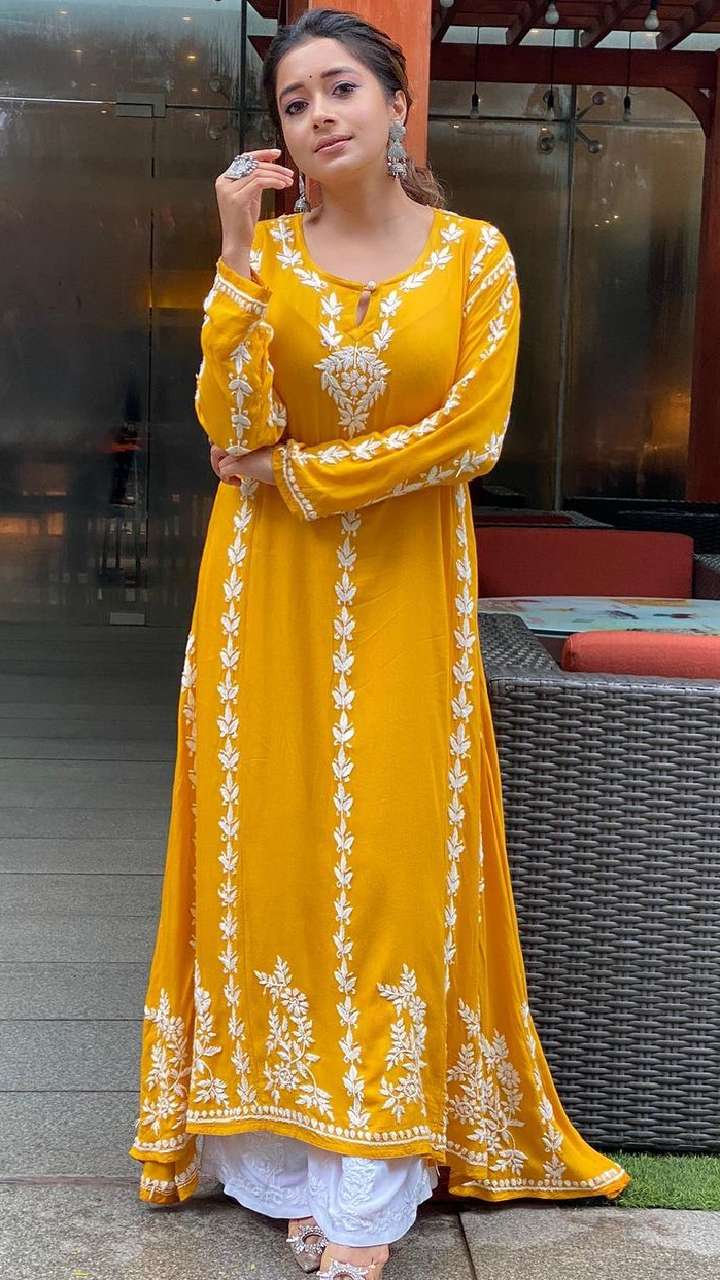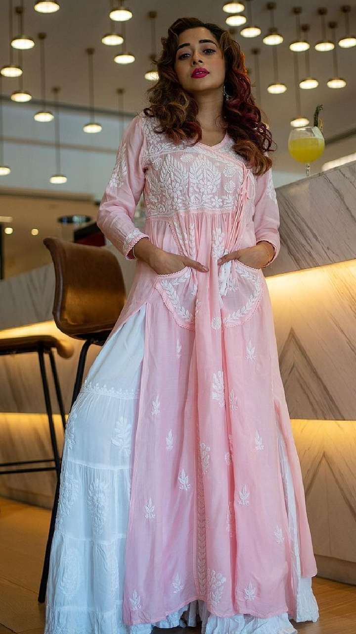 टीना का ये कॉटन शरारा सूट लुक आप भी कैरी कर सकती हैं। इसके साथ एक्ट्रेस ने मिरर वर्क चोकर पेयर किया है।