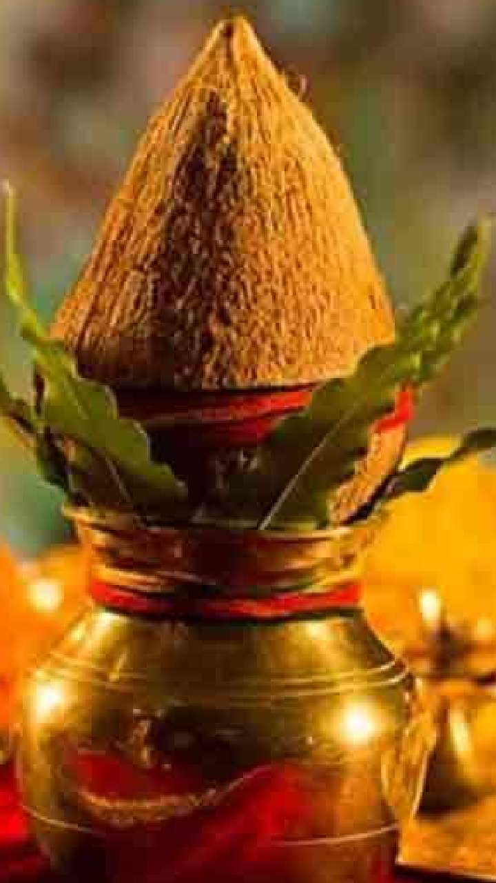 फिर उस कलश में जल भरकर उसमें उसमें तांबे का सिक्का डाल दें। इसके पश्चात उसमें नारियल के पत्ते डालकर उसके मुख पर नारियल रख दें।