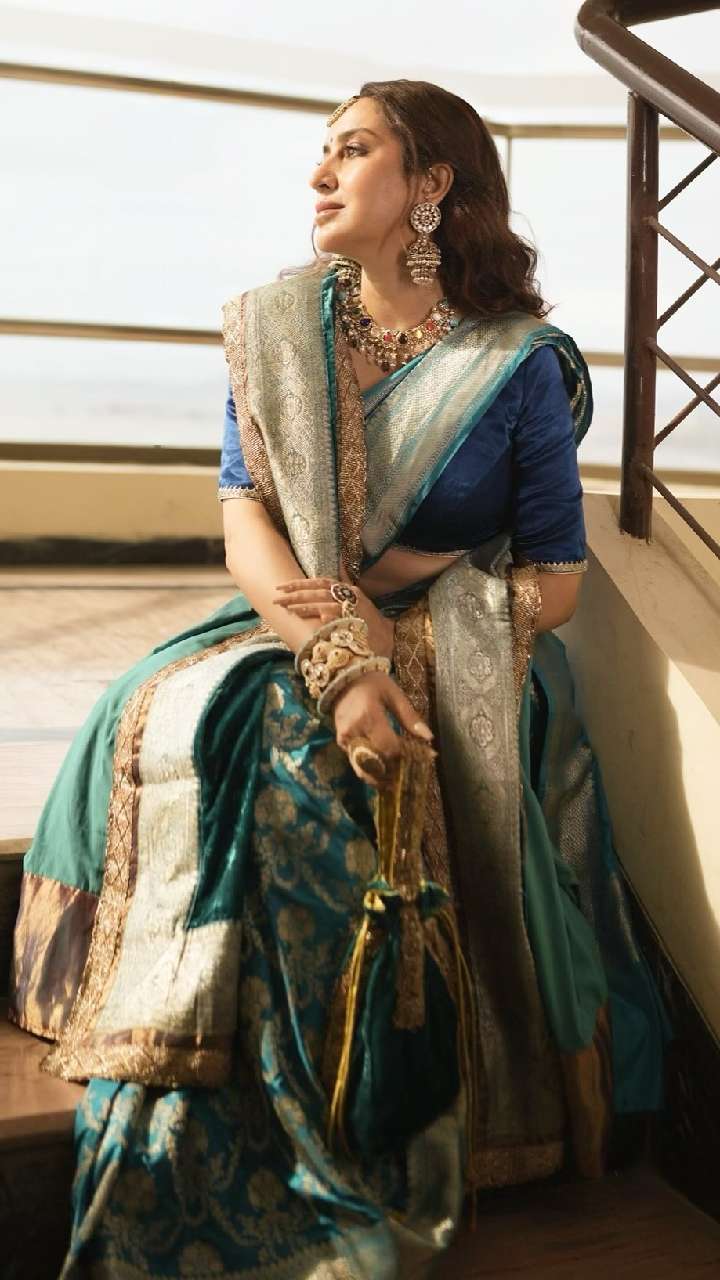 अपने लुक को रॉयल बनाने के लिए आप टिस्का चोपड़ा की तरह ही बनारसी साड़ी को स्टाइल कर सकती हैं। बनारसी साड़ी के साथ एक्ट्रेस ने वेलवेट ओढ़ना पेयर किया है।