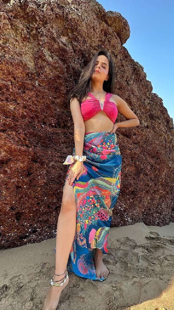 पिंक बिकिनी और स्लिट स्कर्ट में पलक काफी हॉट लग रहीं हैं, एक्ट्रेस का ये लुक बीच के लिए परफेक्ट है।