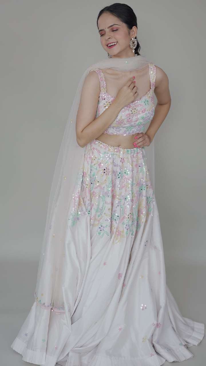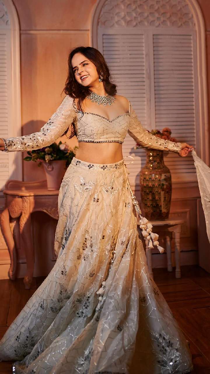 यदि आपको व्हाइट कलर पसंद है और फंक्शन में खुद को डिफरेंट लुक देना चाहती हैं तो पलक का व्हाइट मिरर वर्क लहंगा बेस्ट ऑप्शन है।