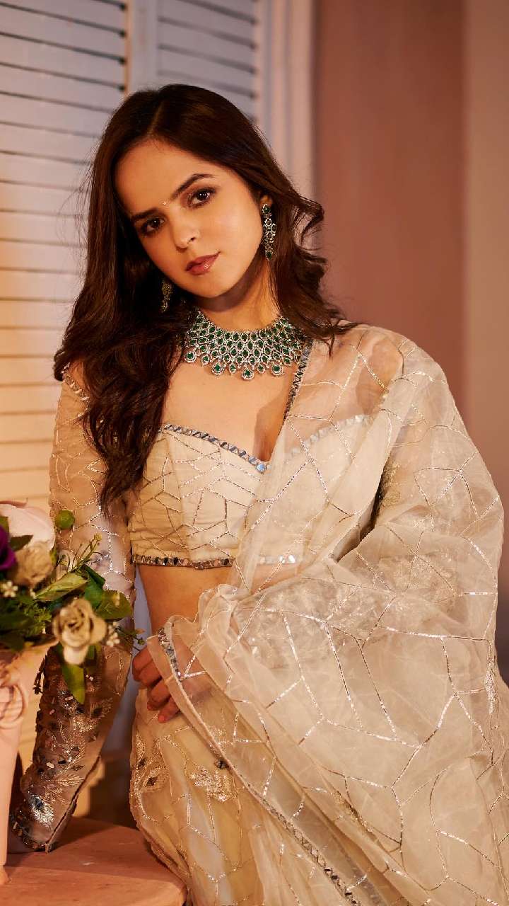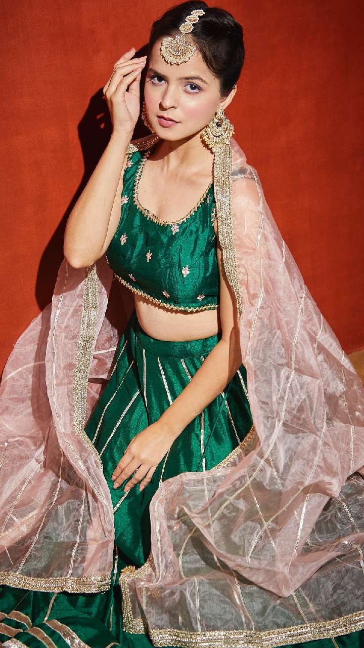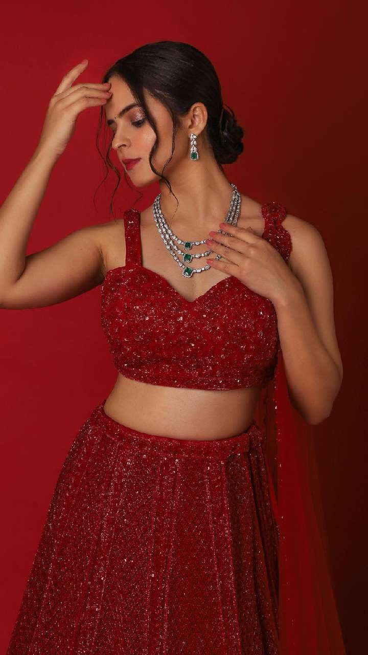 रिस्पेशन पार्टी में इस तरह के शिमरी लहंगे बोल्ड लुक देते हैं। अभिनेत्री शिमरी लहंगे के साथ स्ट्रैपी चोली में बवाल मचा रही हैं।