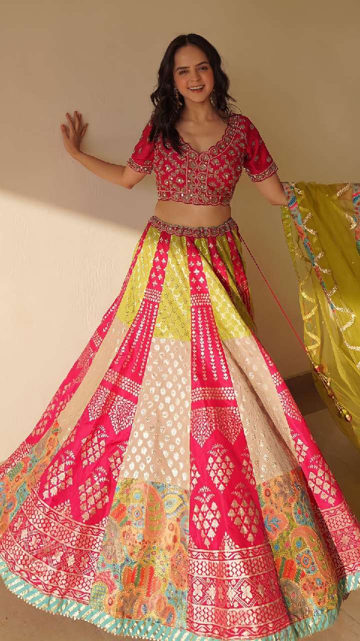 पलक सिंधवानी का प्रिंटेड चोली विद डबल शेड लहंगा खूबसूरत लग रहा है। इसे आप हल्दी मेहंदी किसी भी फंक्शन में पहन सकती हैं।