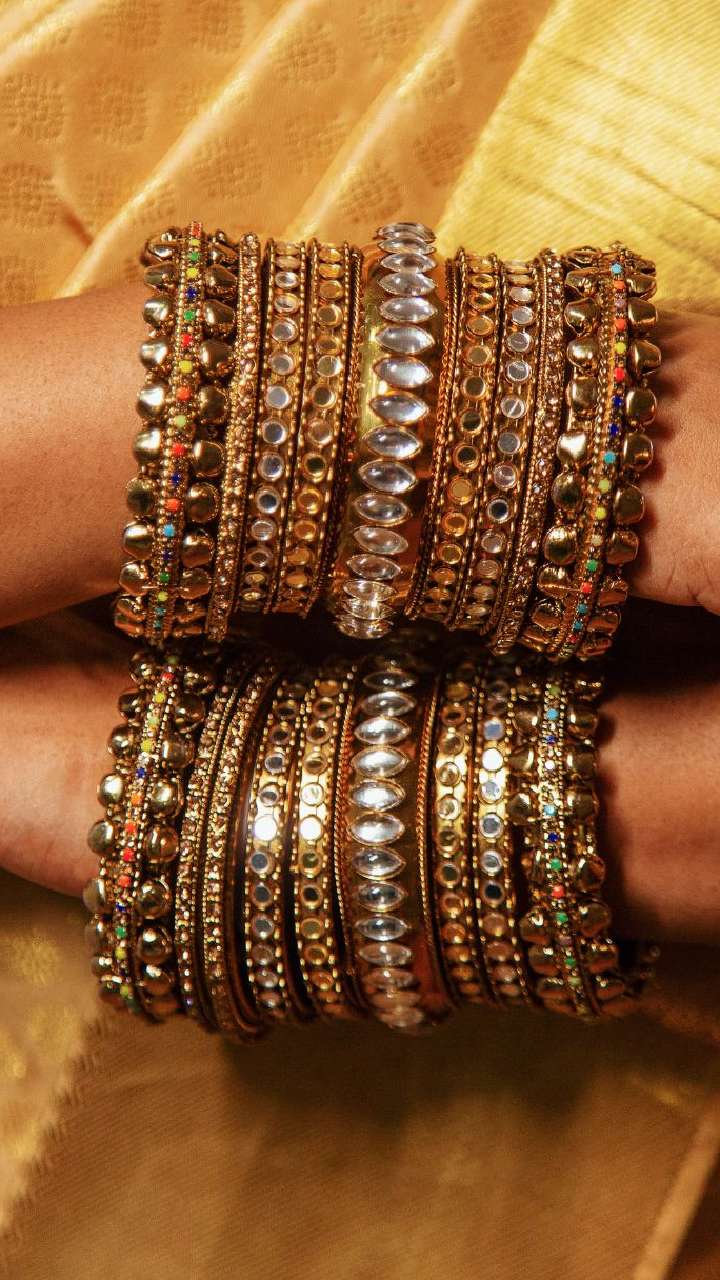 अगर आप सिंपल चूड़ियां पहनते बोर हो गई हैं, तो गोल्डन कलर की चूड़ियां हर मौके पर खास लगती हैं। आप चूड़ियों के साथ मैचिंग कंगन भी पेयर कर सकती हैं।