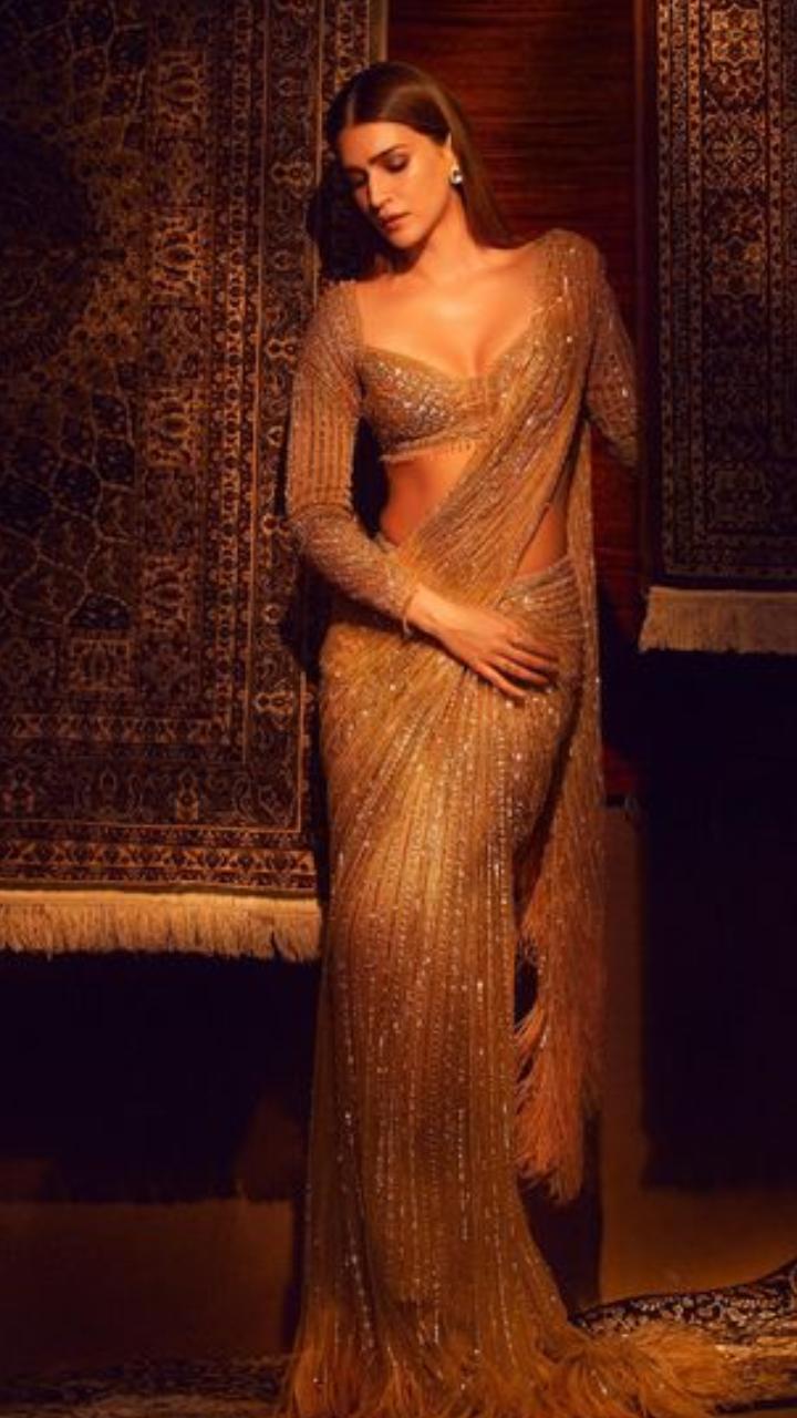 बॉलीवुड एक्ट्रेस कृति सेनन पर इंडियन लुक काफी सूट करता है। कृति इस गोल्डन शिमर साडी में कहर ढहा रही हैं।