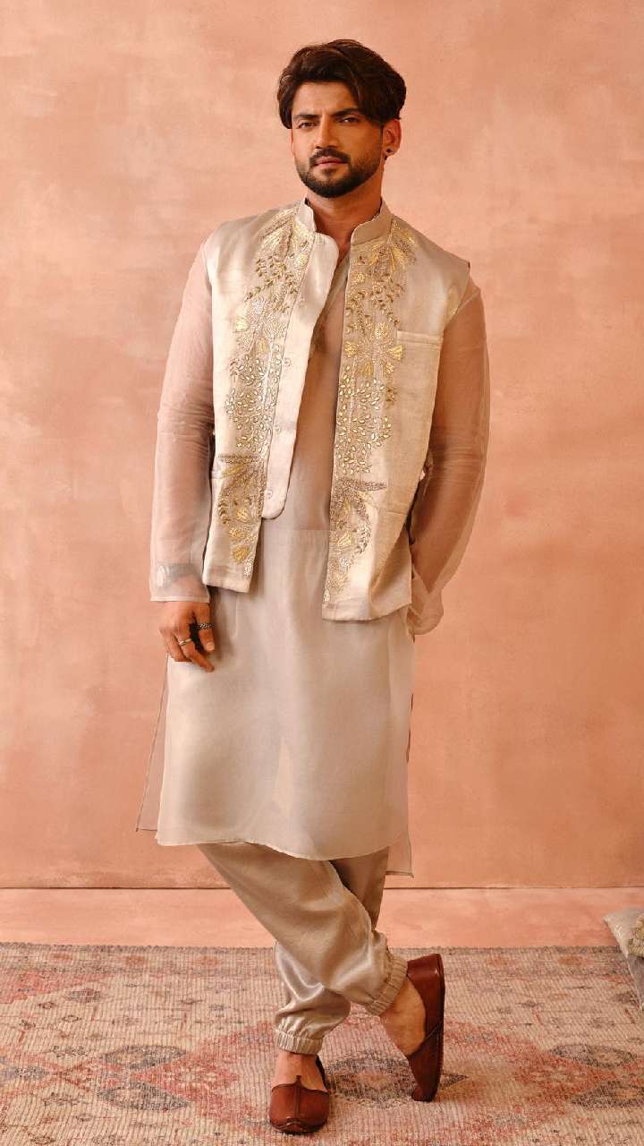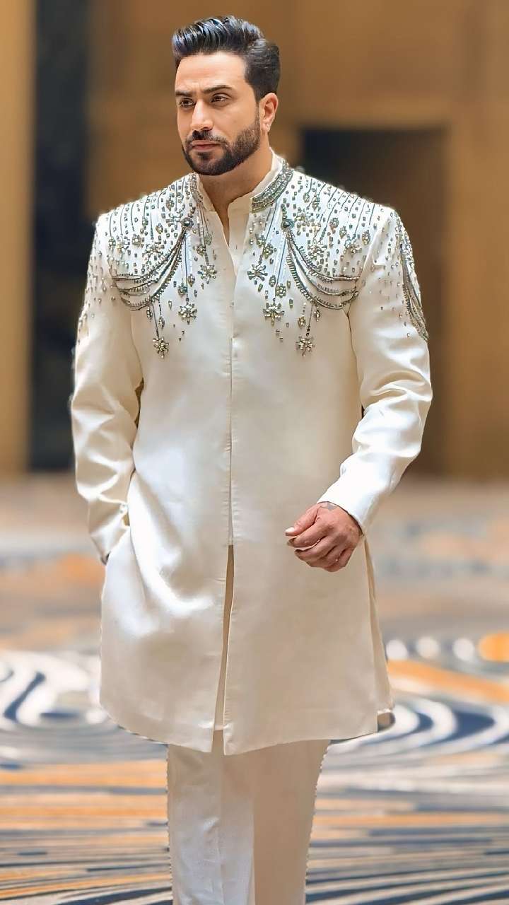 अगर आप रॉयल लुक कैरी करना चाहते हैं, तो व्हाइट कलर का अचकन एकदम परफेक्ट है। आप आउटफिट के हिसाब से फुटवियर कैरी करें।