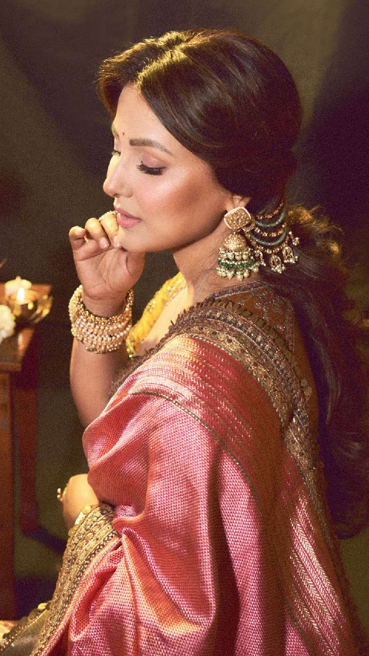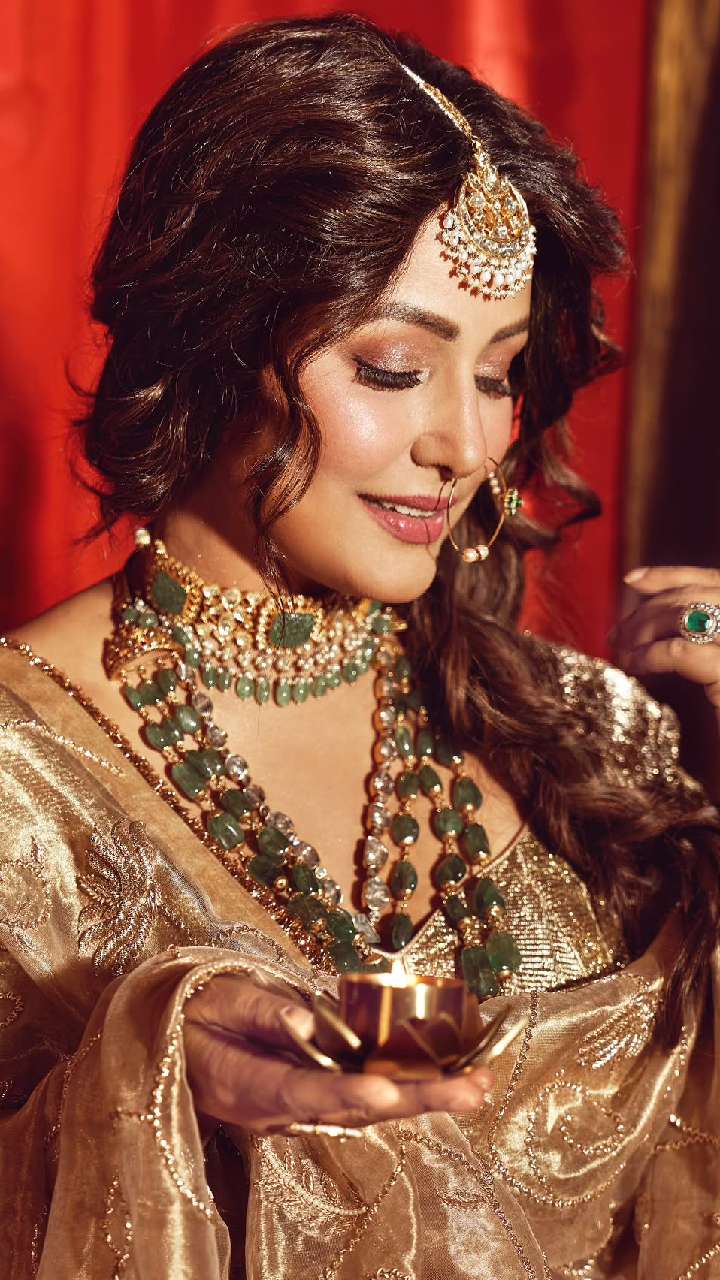 हिना ने डार्क आई शैडो के साथ आंखों को ग्लिटरी लुक दिया है, जो उनको रॉयल लुक दे रहा है।