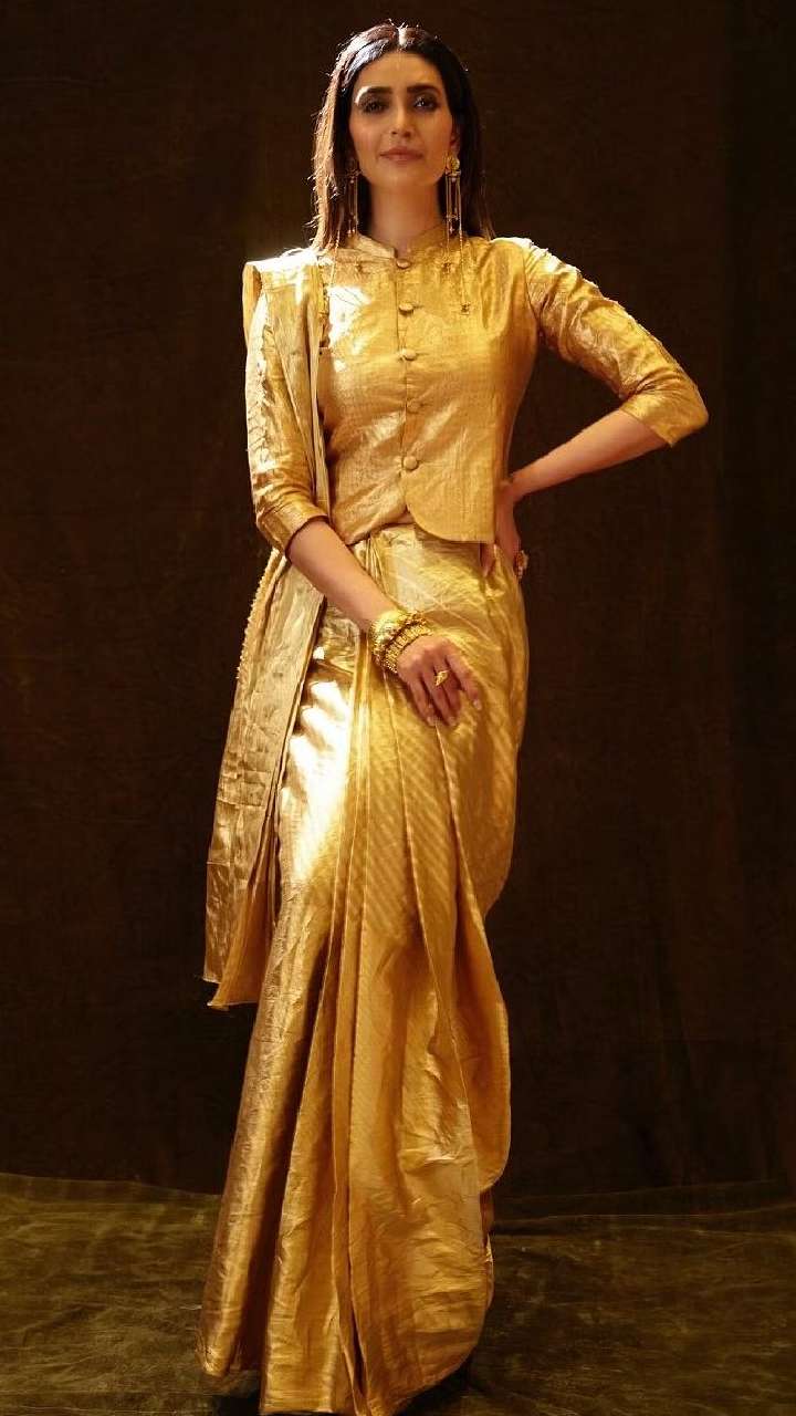 करिश्मा तन्ना ने गोल्डन साड़ी के साथ कोटी वाला ब्लाउज पेयर किया है। करिश्मा का ये लुक बेहद शानदार लग रहा है।