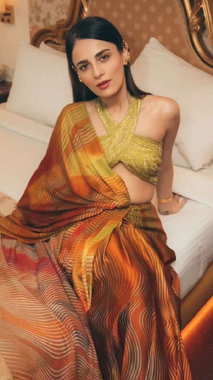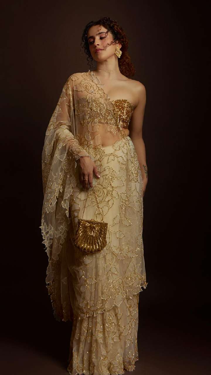 सान्या मल्होत्रा ने ऑफ व्हाइट साड़ी के साथ गोल्डन कलर का ट्यूब ब्लाउज पेयर किया है। एक्ट्रेस का ये लुक काफी हॉट है।