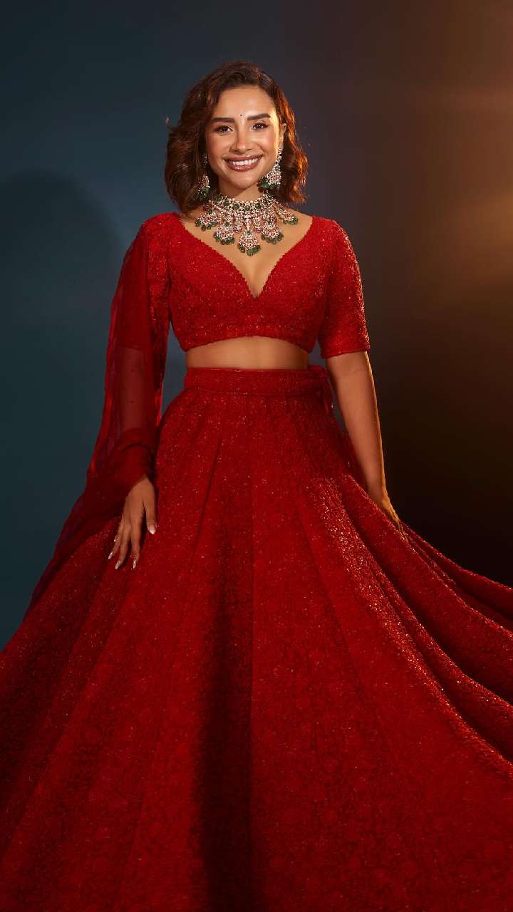 रेड कलर के इस लहंगे में पत्रलेखा का लुक काफी शानदार लग रहा है। आप भी लीफ पैटर्न ब्लाउज साड़ी या फिर लहंगे के साथ पहन सकती हैं।