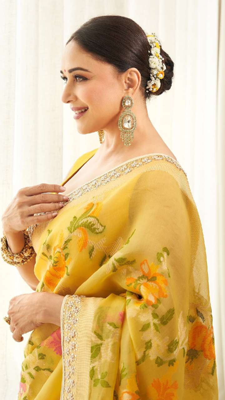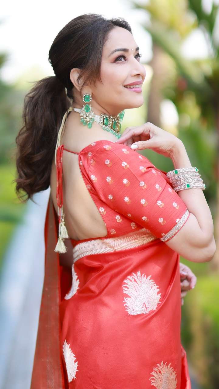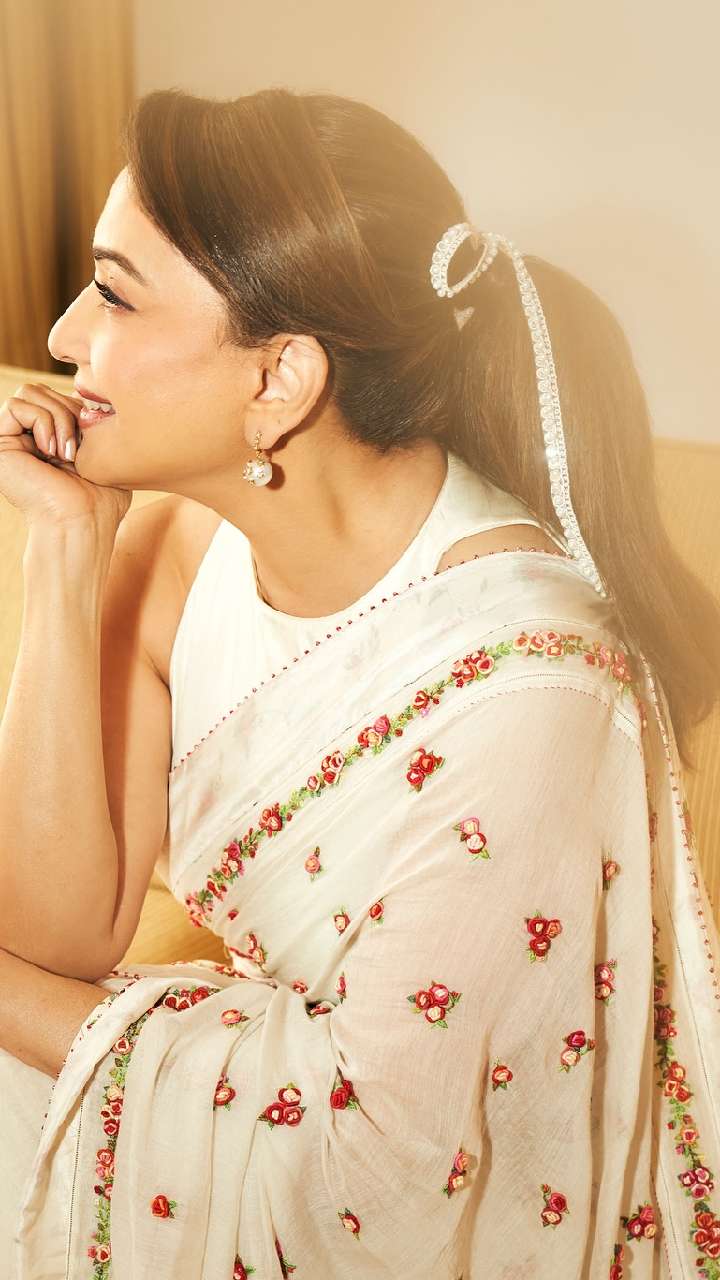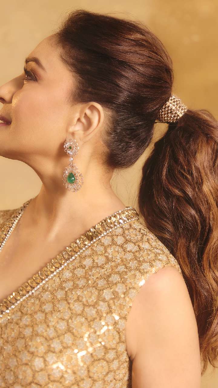 माधुरी की तरह अपनी लुक को सिंपल और सोबर रखना चाहती हैं, तो आउटफिट के साथ ऐसा पोनीटेल हेयर स्टाइल बनाकर महफिल की जान बन सकती हैं।