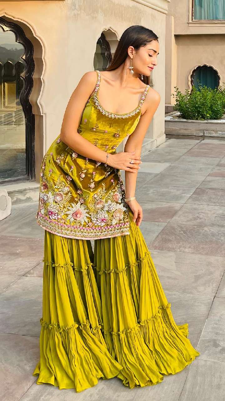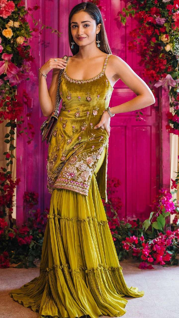 फिलहाल शरारा पैटर्न सूट काफी ज्यादा ट्रेंड में चल रहे हैं। त्रिधा चौधरी का ये शरारा पैटर्न सूट ईद के लिए परफेक्ट है।