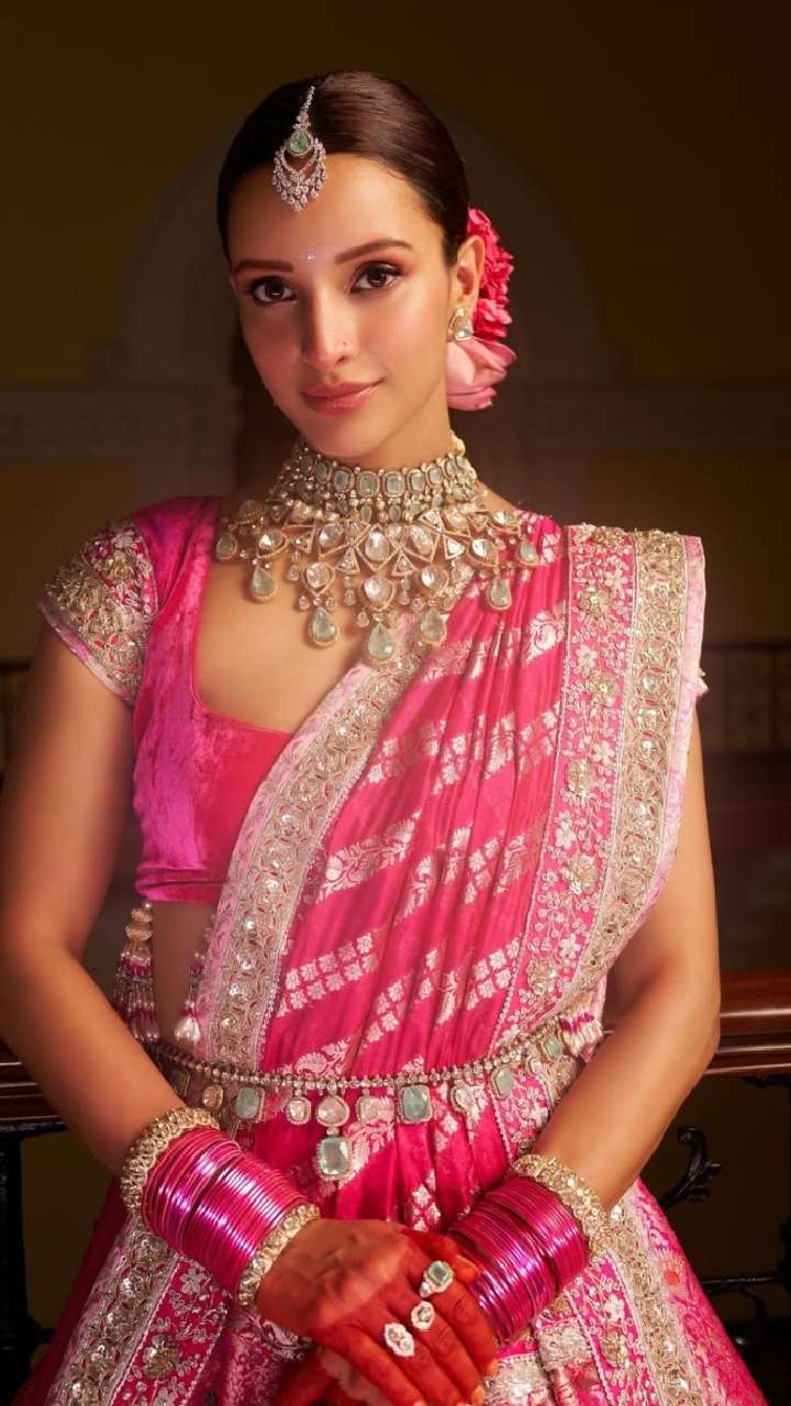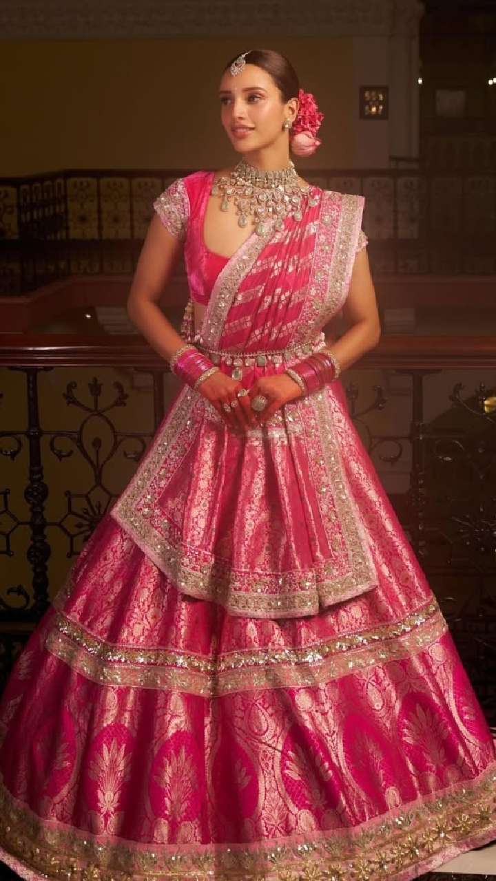 खूबसूरत से पिंक लहंगे में Tripti का यह ब्राइडल लुक बेहद खूबसूरत लग रहा है। इसके साथ उन्होंने जुड़ा बनाया है, जिसमें बड़े फूल लगाए हुए हैं। गले में हैवी ज्वेलरी और कानों में टिप्स इस लुक को कंप्लीट कर रहे हैं।