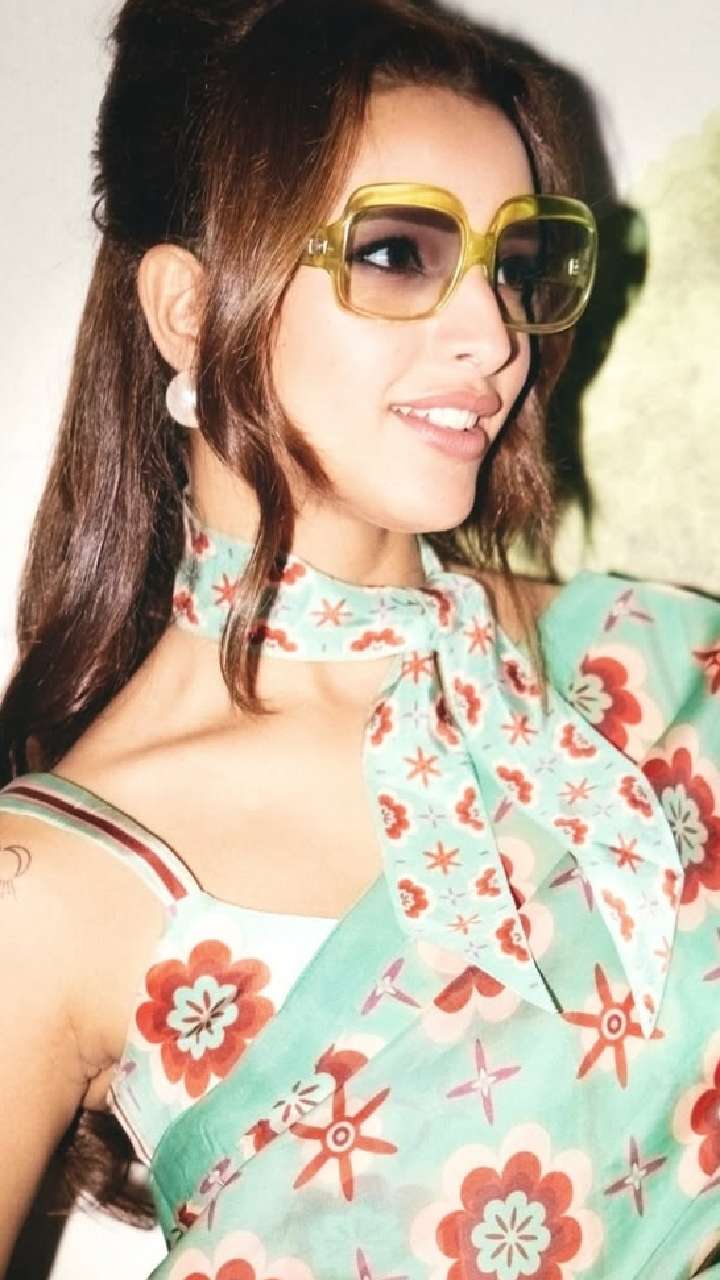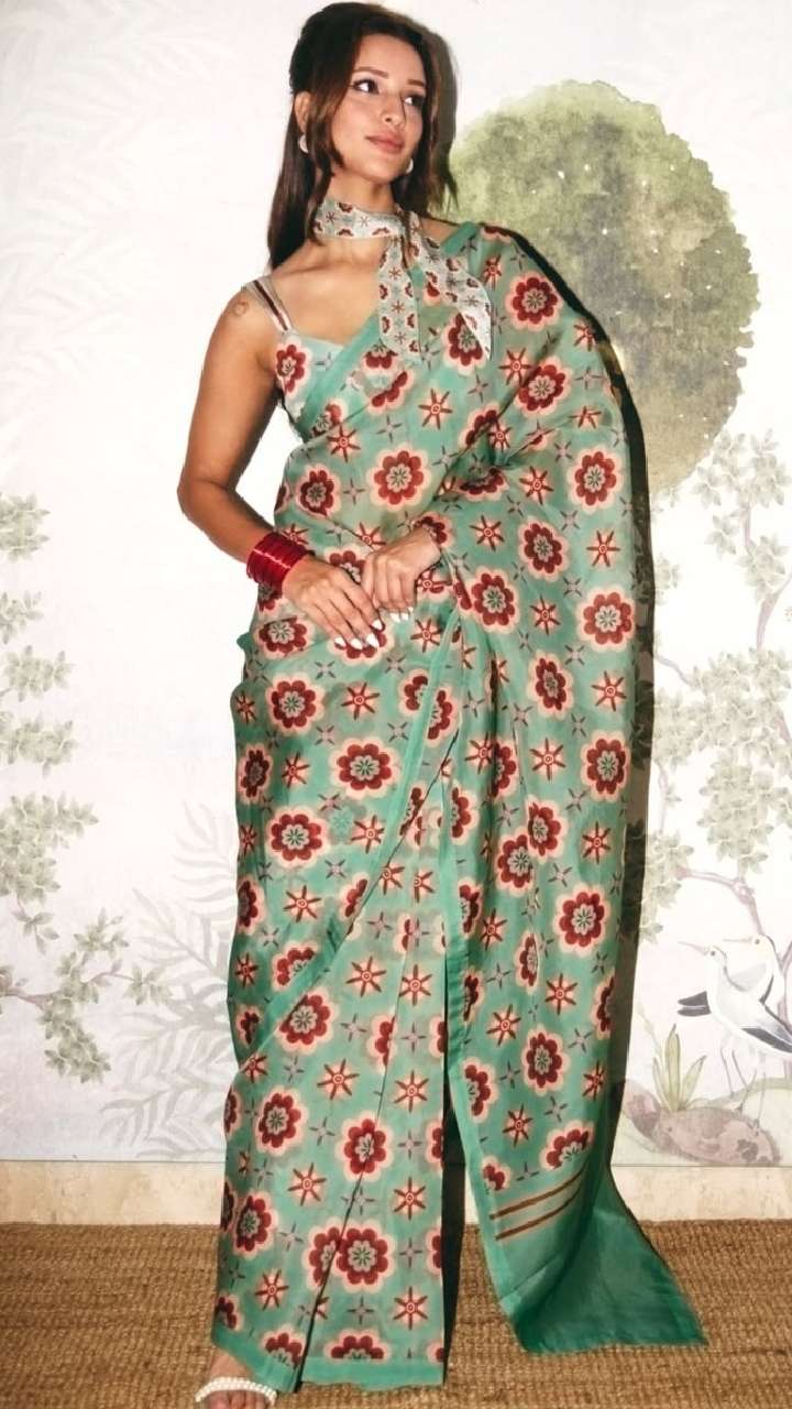 इसमें तृप्ति डिमरी ने पिता ग्रीन कलर की प्रिंटेड साड़ी पहनी हुई है। इस साड़ी को उन्होंने रेट्रो बॉलीवुड स्टाइल में पहना हुआ है, जिसमें वो काफी ज्यादा जच रही हैं।