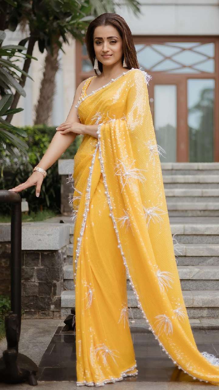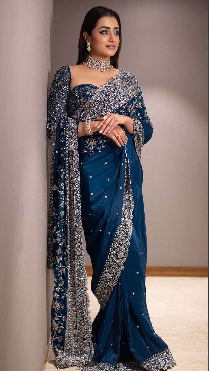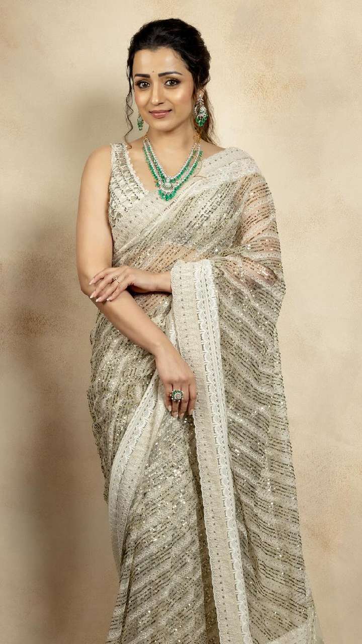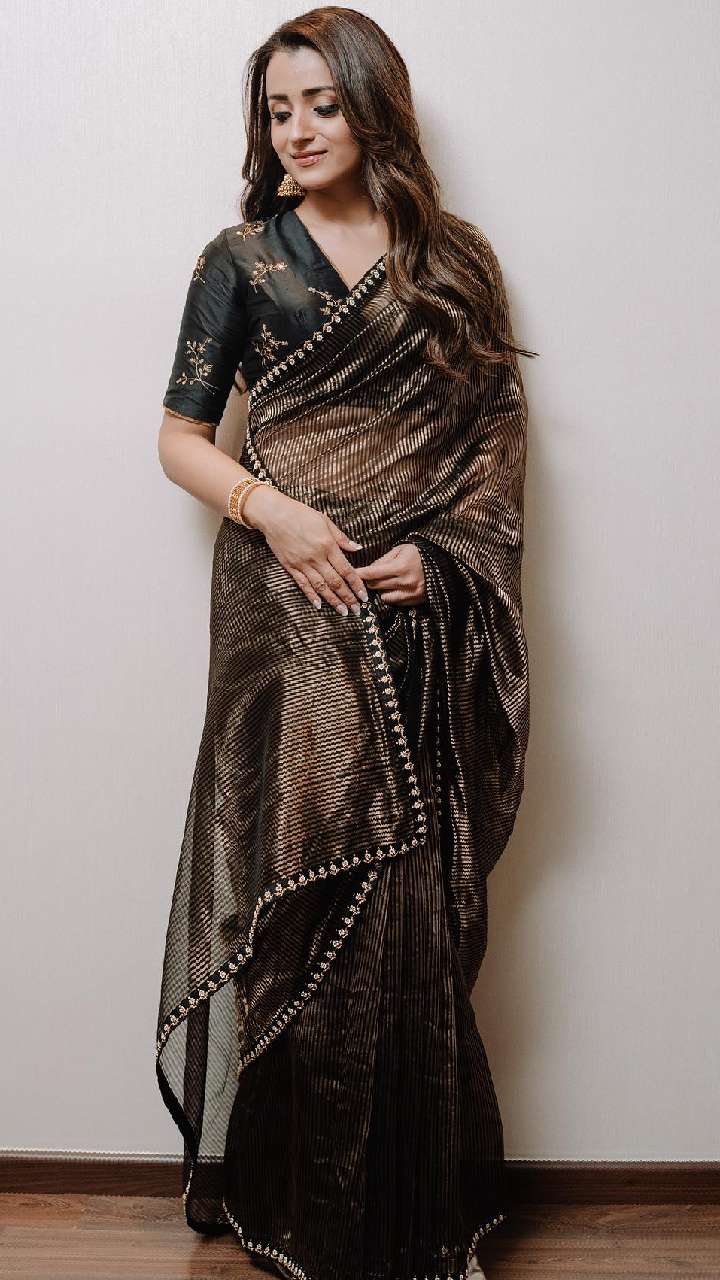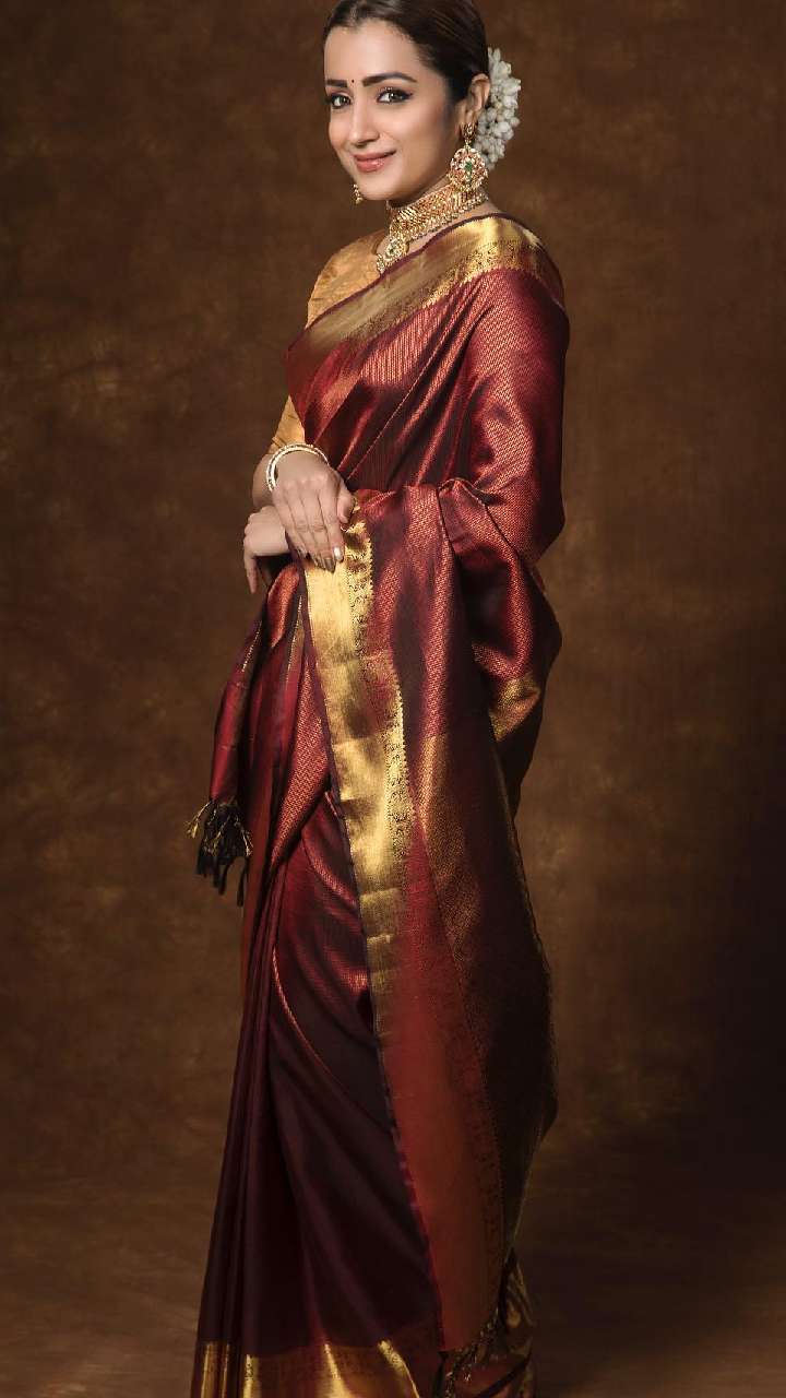 तृषा का स्टाइल हमेशा से रॉयल रहा है। इस फोटो में उन्होंने गोल्डन बॉर्डर वाली सिल्क साड़ी पहनी है, जिसमें वह काफी रॉयल लुक दे रही हैं। ऐसी साड़ी 40 प्लस पर खूब जचती हैं।