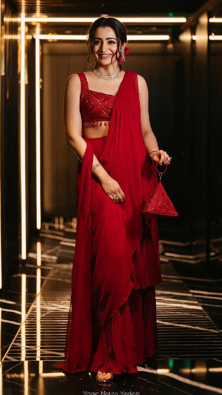 पार्टी में स्टाइलिश साड़ी पहनना चाहती हैं, तो एक्ट्रेस की तरह रेड कलर की इंडो-वेस्टर्न साड़ी से आइडिया ले सकती हैं। इस तरह की साड़ी कॉकटेल पार्टी के लिए बेस्ट होती हैं।