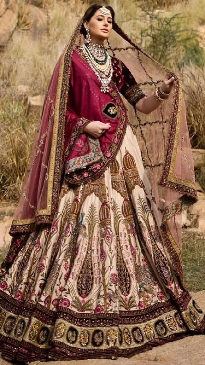 नरगिस इस लहंगे में काफी खूबसूरत लग रही हैं। वेलवेट चुन्नी के साथ लहंगे का कलर कॉम्बिनेशन आपको शादी में पद्मावत मूवी जैसी रानी का लुक देगा।