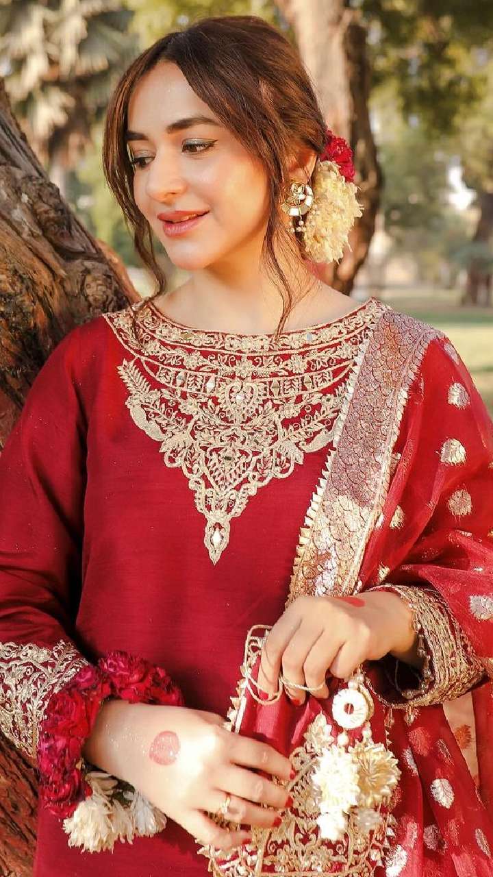 पाकिस्तानी एक्ट्रेस के एम्ब्रॉयडरी सूट देखने में ही काफी फंक्शन वाइब्स देते है। ऐसे सूट हल्के रंग के होते है जिन पर गहरी कढ़ाई की जाती है। आप सूट को स्लीक हेयर स्टाइल और मिनिमल मेकअप के साथ पेयर कर सकती हैं, ताकि आपका लुक सिंपल और अट्रैक्टिव दिखे।