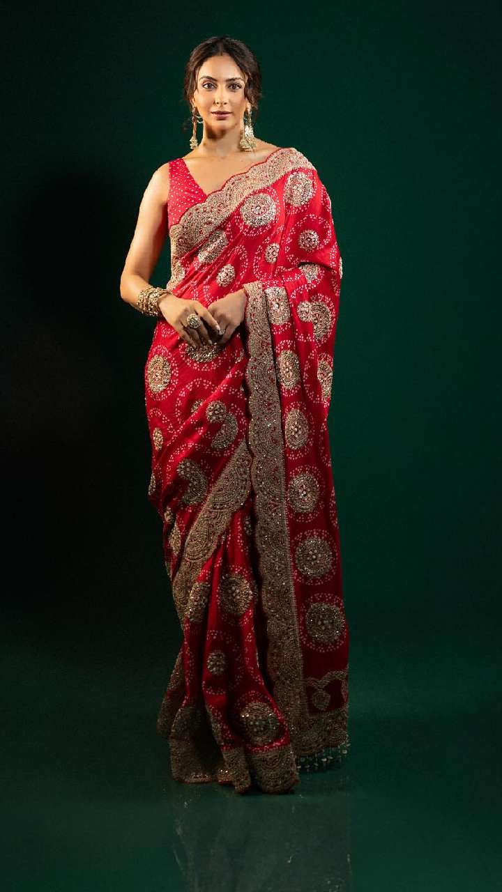 नई नवेली दुल्हन ससुराल में संस्कारी दिखने के लिए एक्ट्रेस की इस स्टाइलिश और एलिगेंट लुक देने वाली लाल साड़ी को स्टाइल कर सकती हैं। साथ ही, लुक को कंप्लीट करने के लिए टाइट बन हेयर स्टाइल ट्राई करें।