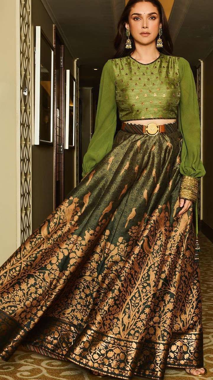 बेहद कंफर्टेबल और स्टाइलिश ऑप्शन। जिसमें आप मेहंदी फंक्शन को बिंदास होकर एंजॉय कर सकती हैं। बनारसी स्कर्ट के साथ जॉर्जेट या सैटिन शर्ट है बेस्ट कॉम्बिनेशन।