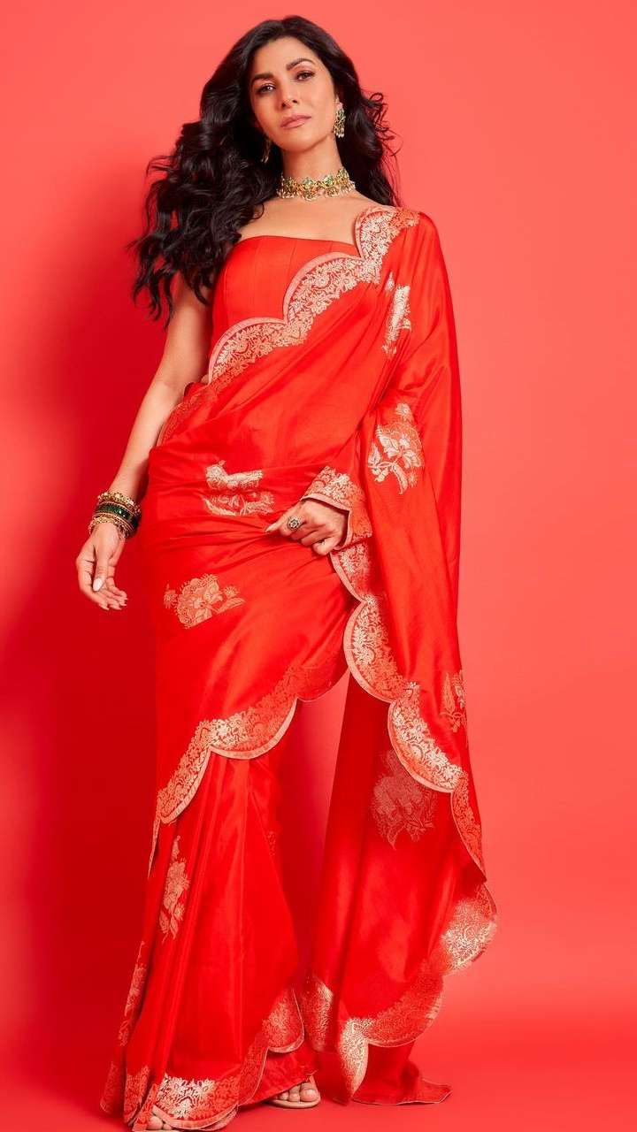 लाल कलर हर लड़की पर सुंदर लगता है, लेकिन एक्ट्रेस की इस रेड कलर साड़ी का बॉर्डर बेहद सुंदर लग रही है। आप ऑक्सीडाइज साड़ी के साथ इस साड़ी को डिजाइन कर सकती हैं।
