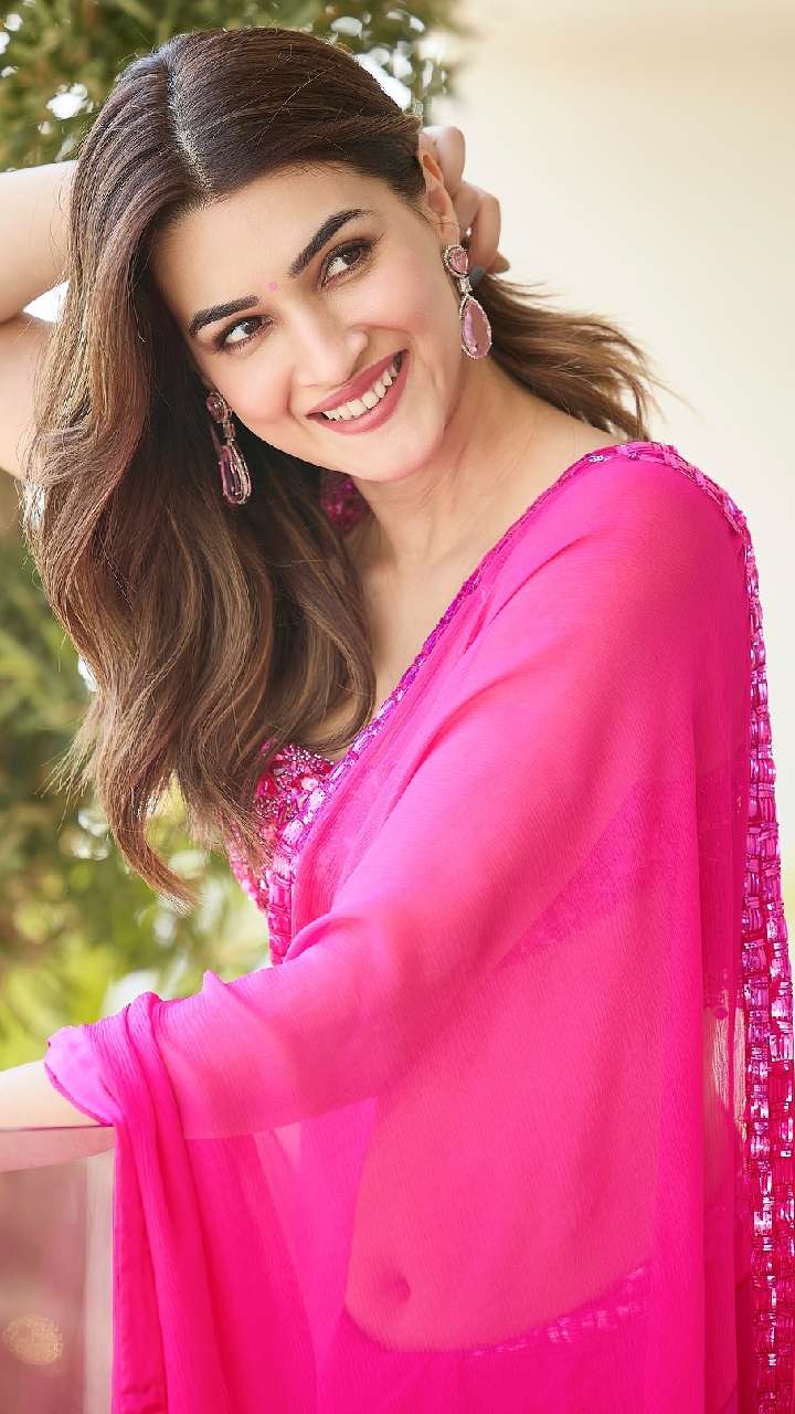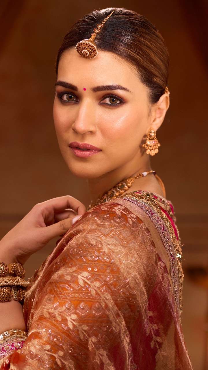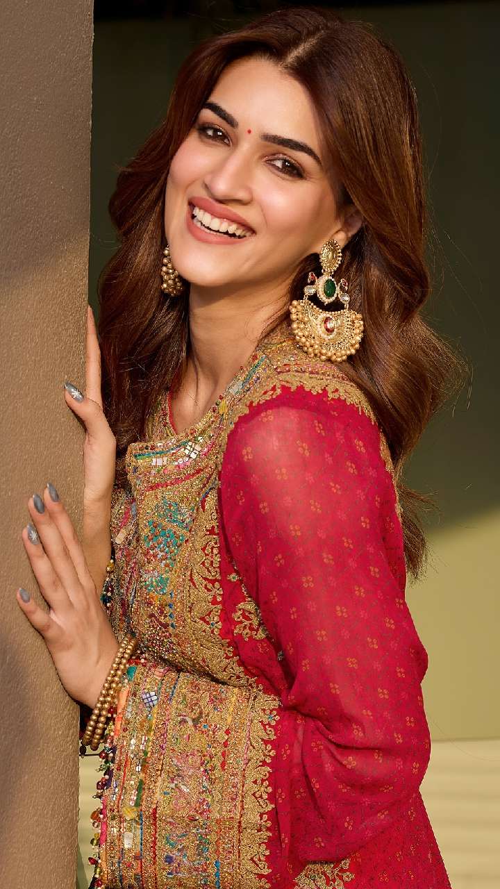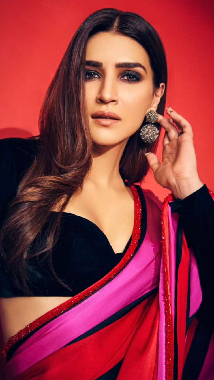 एक्ट्रेस लाल कलर की साड़ी में बेहद खूबसूरत लग रही हैं। Kriti sanon के स्टड इयररिंग्स उनके चेहरे पर एक क्लासी लुक दे रहे हैं।