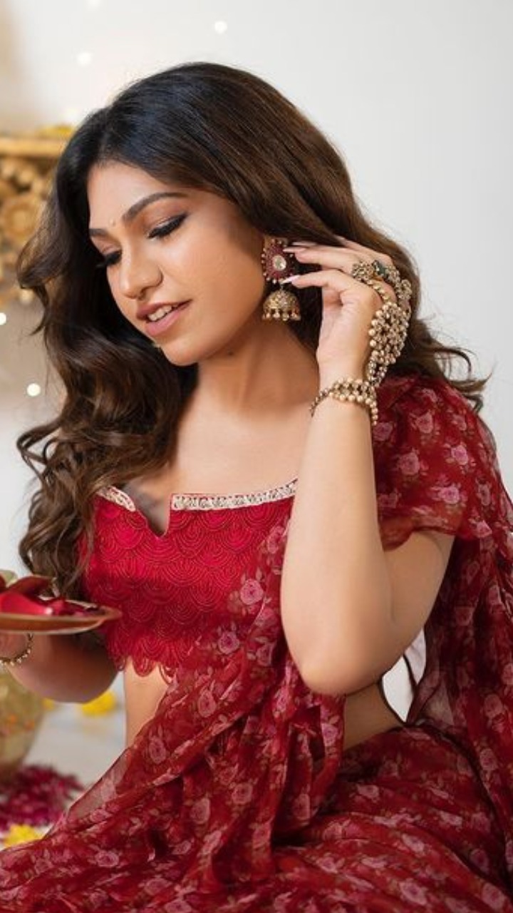 ब्यूटिफुल साड़ी लुक के साथ बेहद हॉट ब्लाउज कैरी किया हैं और झुमके से लुक को कंप्लीट किया है।