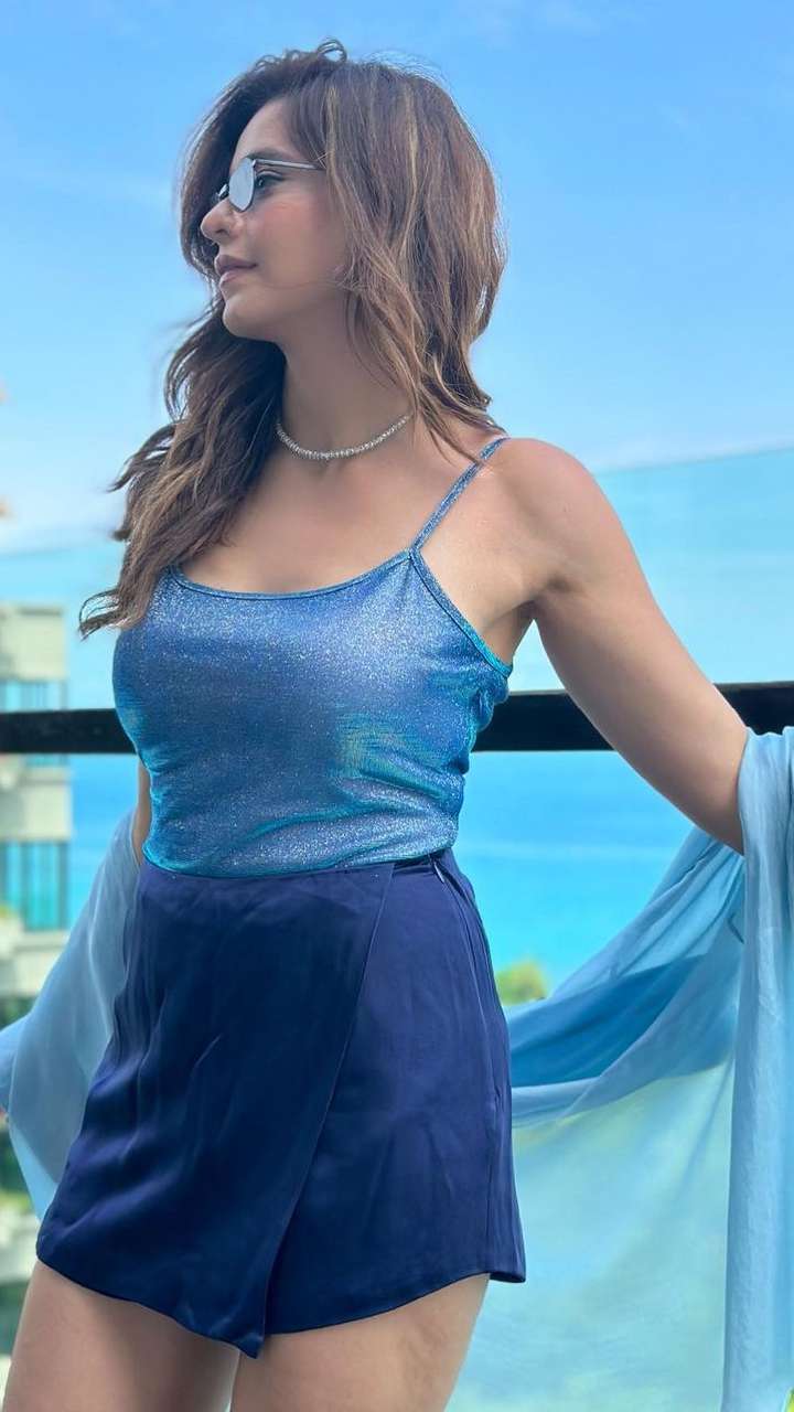 ब्लू शॉट्स के साथ आमना ने ब्लू शिमरी टॉप कैरी किया है, एक्ट्रेस ने अपने लुक को श्रग से पूरा किया है।