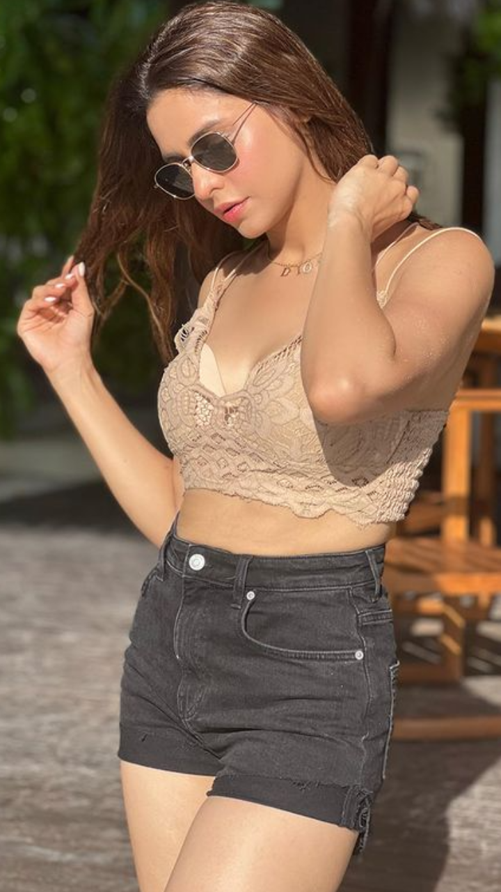 आमना शरीफ शॉर्ट्स ब्रालेट में काफी हॉट लग रही हैं।