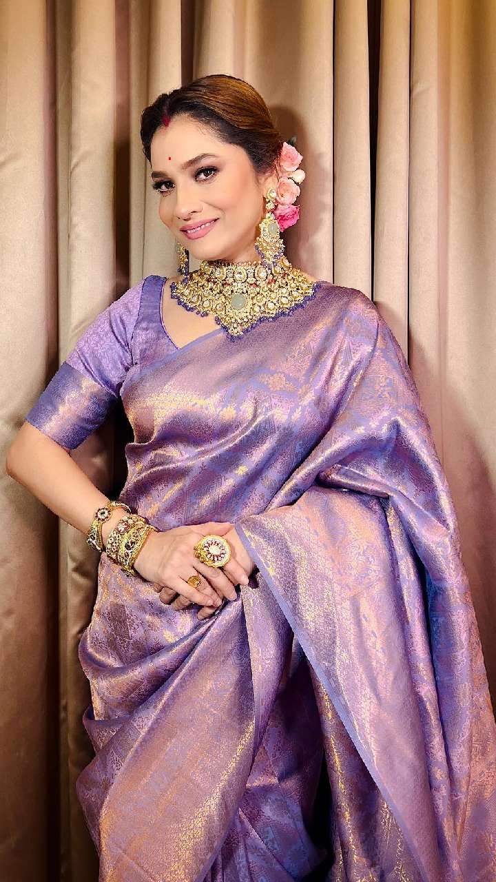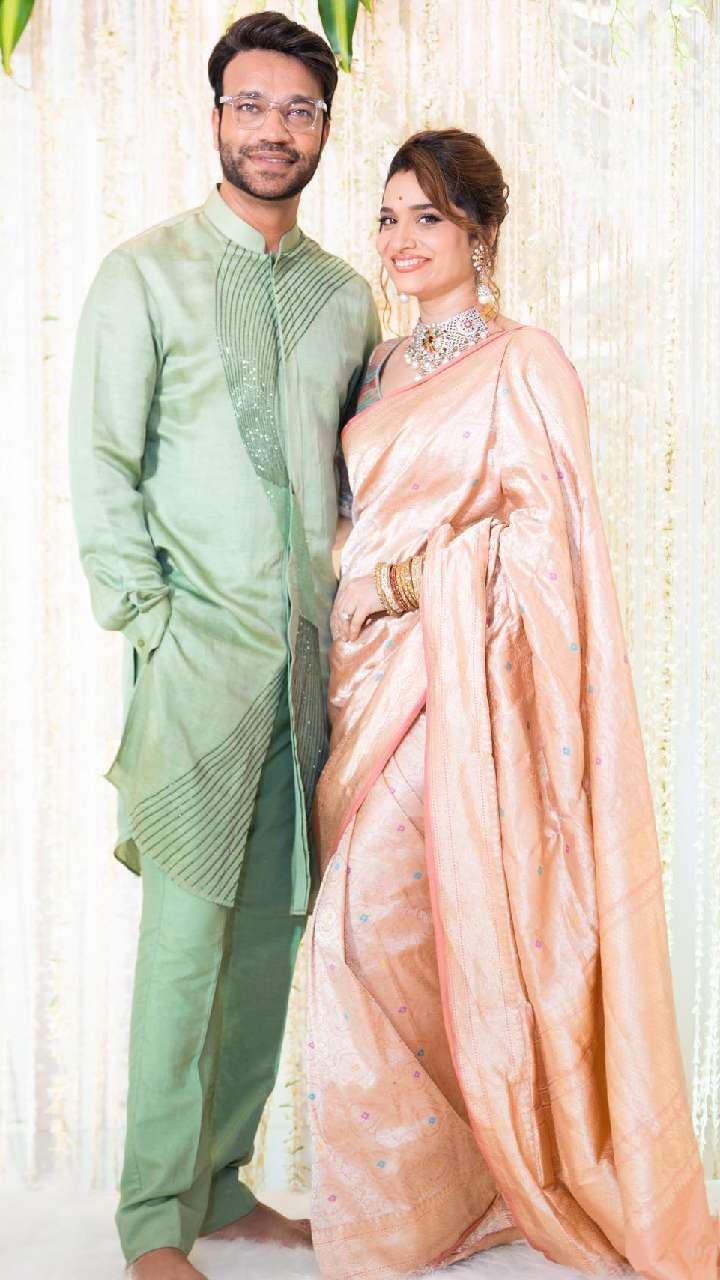 अंकिता और विक्की अपने हर अटायर में परफेक्ट पेयर लगते हैं। कपल का ये लाइट बनारसी साड़ी और विक्की का ग्रीन कुर्ता-पजामा लुक शानदार है।