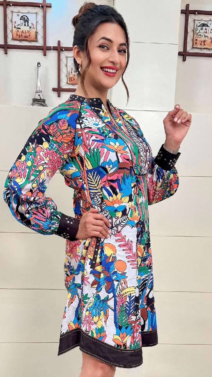 दिव्यांका की प्रिंटेड हाई नेक शार्ट ड्रेस समर सीजन के लिए परफेक्ट है। ऑफिस में ये आपको फंकी लुक देगी।