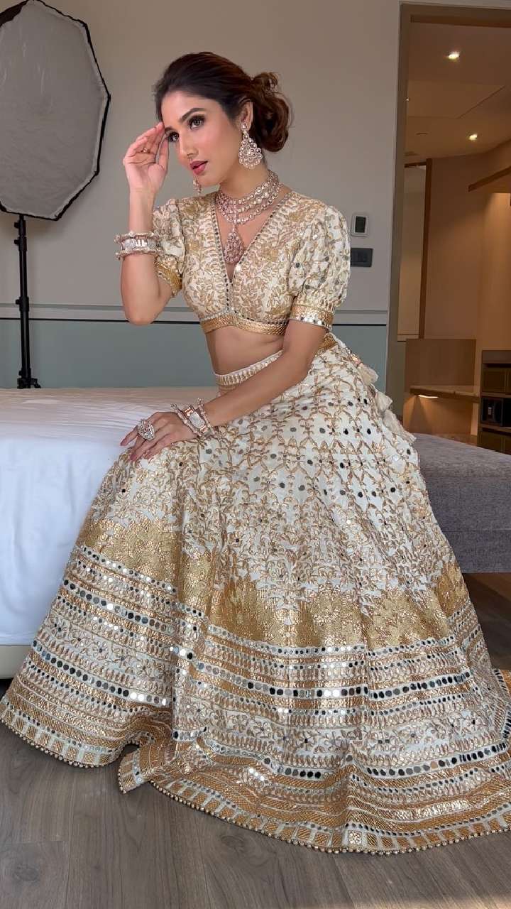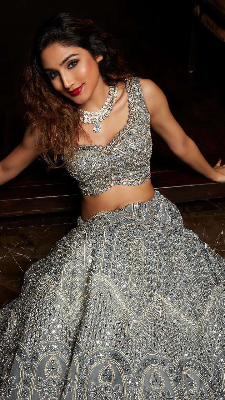 एक्ट्रेस का ग्रे और गोल्डन वर्क लहंगा आपको एकदम शाही लुक देगा। ब्राइडल इसे रोका सेरेमनी में पहनकर अपने लुक में चार चांद लगा सकती हैं।